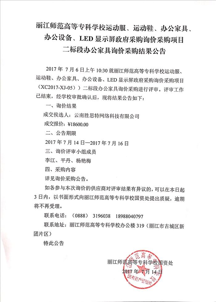 丽江师范高等专科学校运动服、运动鞋、办公家具、办公设备、LED显示屏政府采购询价采购项目二标段办公家具询价采购结果公告