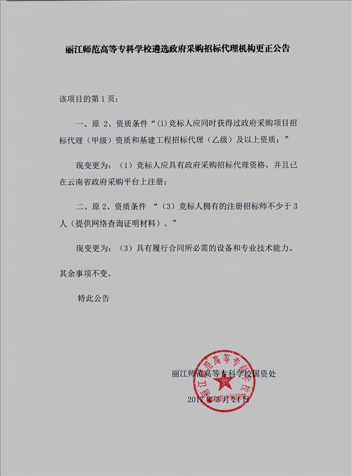 丽江师范高等专科学校遴选政府采购招标代理机构更正公告