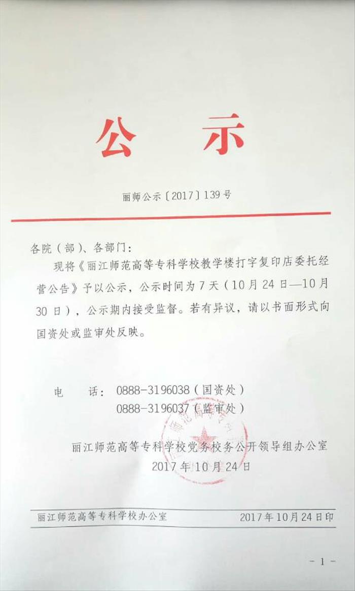2丽江师范高等专科学校教学楼打字复印店委托经营公告.doc