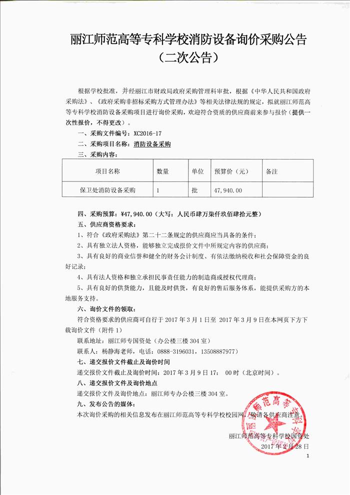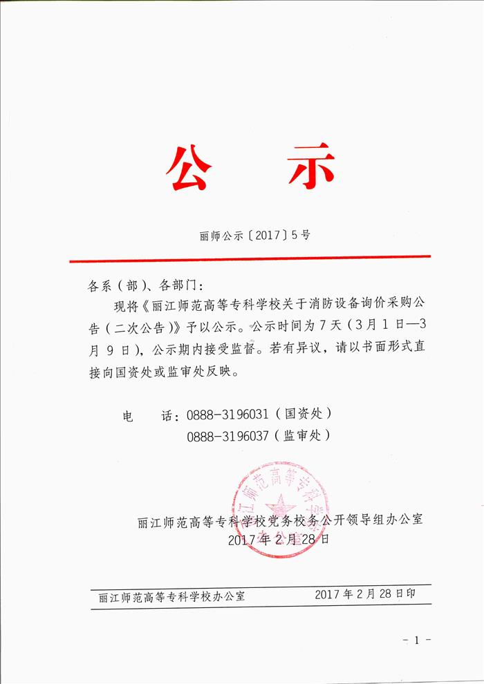 丽江师范高等专科学校消防设备询价采购公告(二次公告)