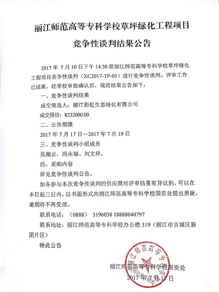 丽江师范高等专科学校草坪绿化工程项目竞争性谈判结果公告