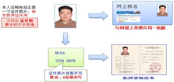 (5)近期一寸免冠彩色相片1张(正规证件相片,用以办理教师资格证书,应与网上申报时上传相片同底版,相片背面写明姓名、身份证号)。