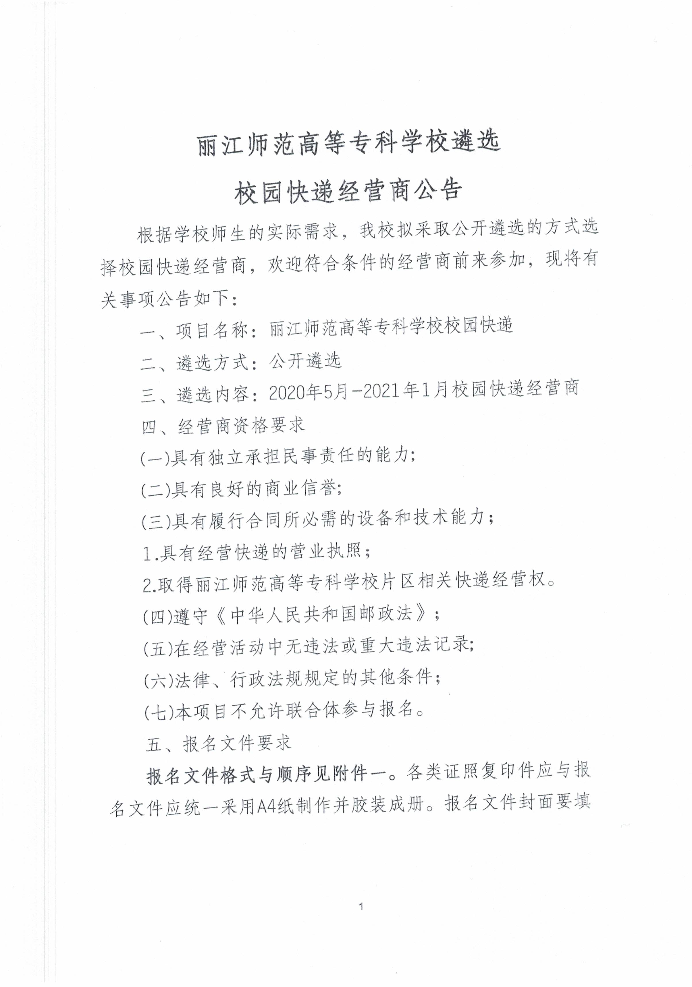 丽江师范高等专科学校遴选校园快递经营商公告