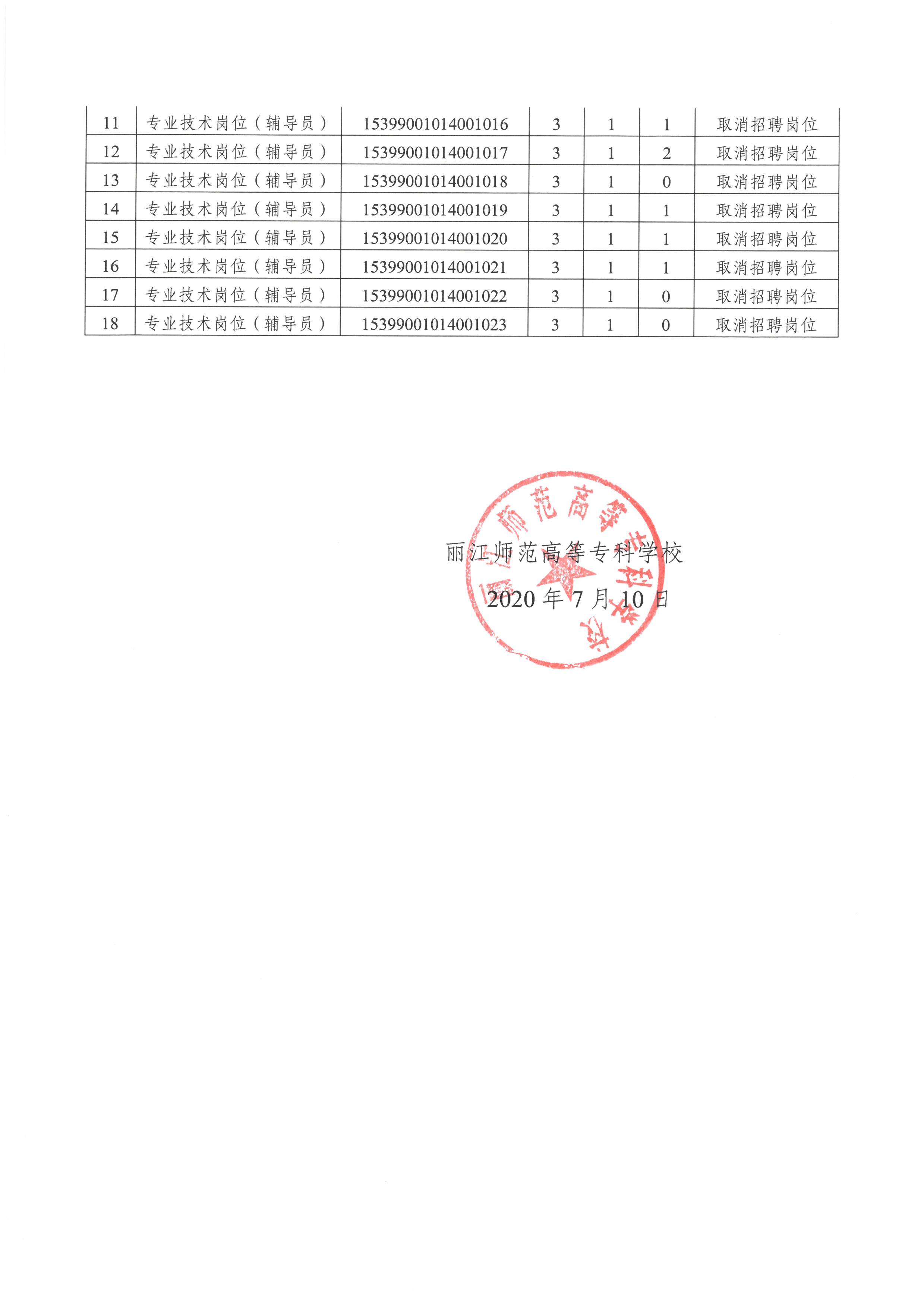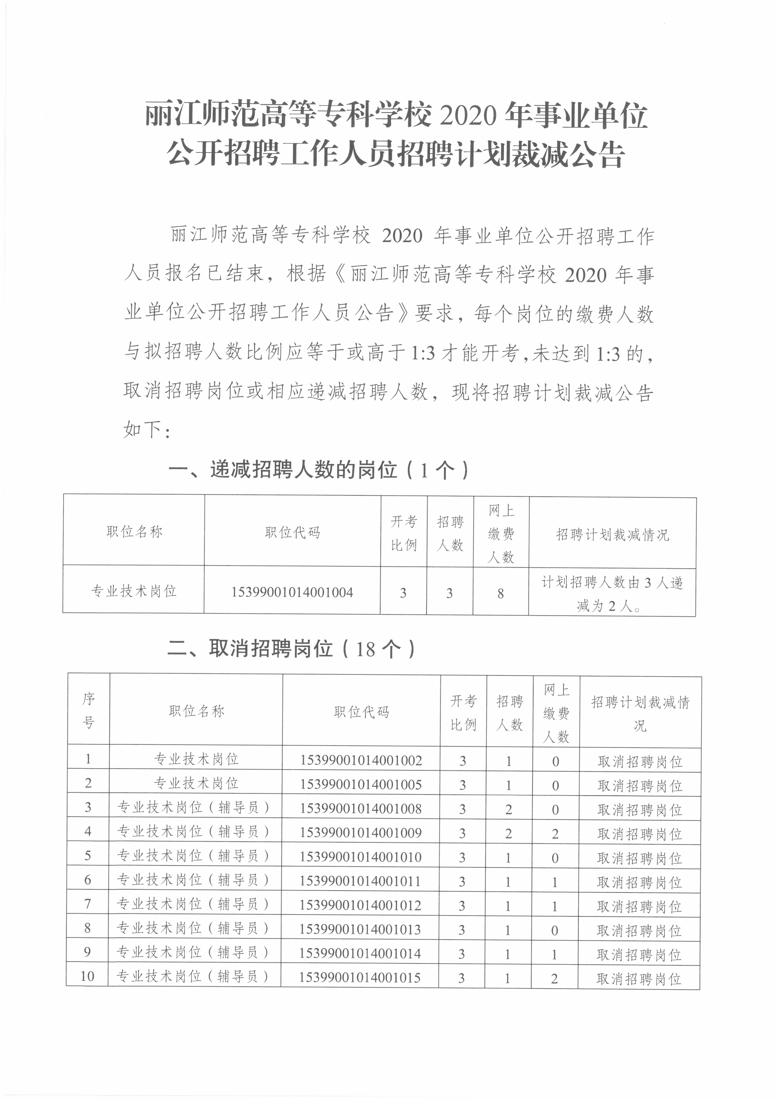 丽江师范高等专科学校2020年事业单位公开招聘工作人员招聘计划裁减公告