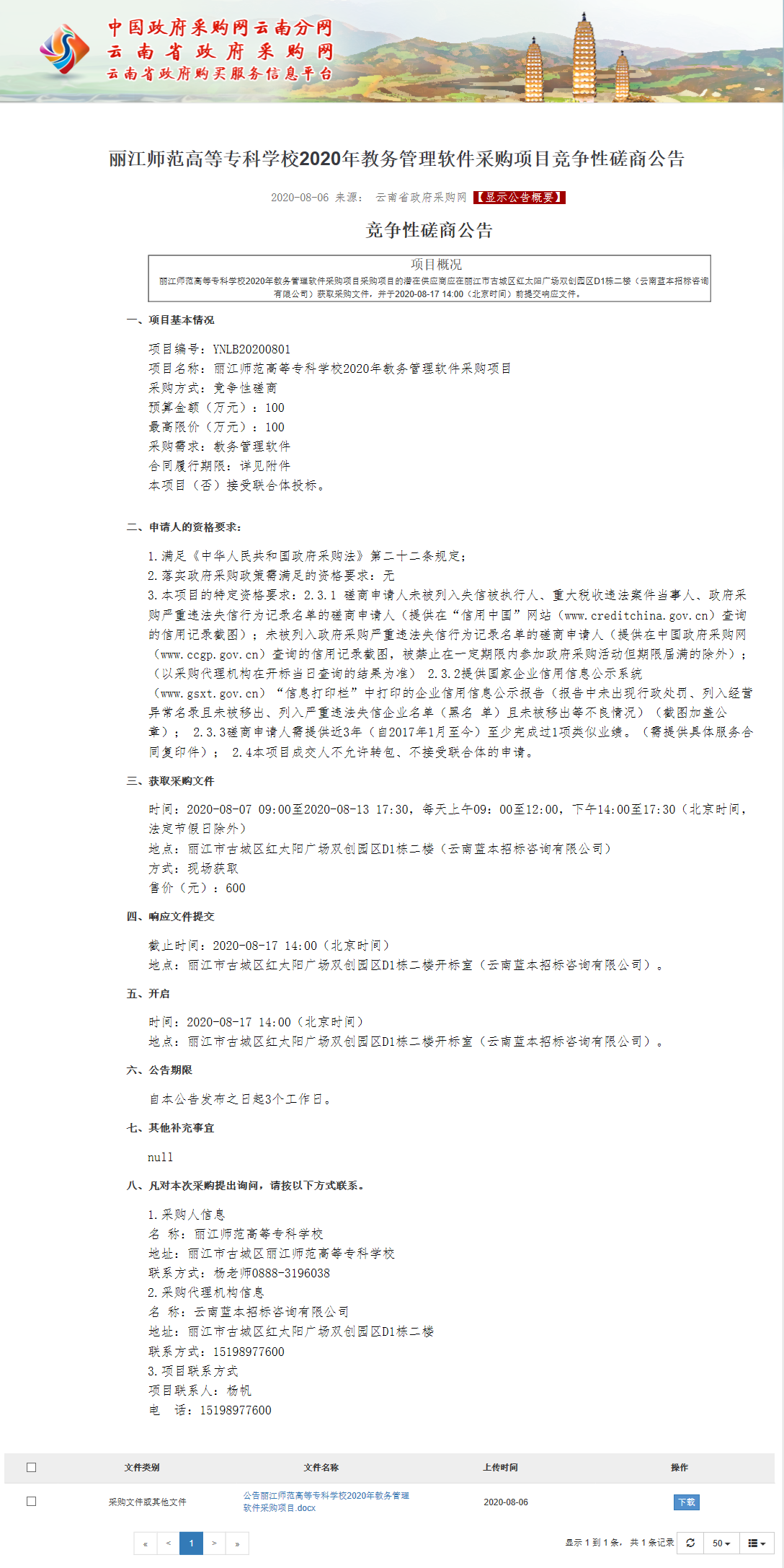 丽江师范高等专科学校2020年教务管理软件采购项目竞争性磋商公告