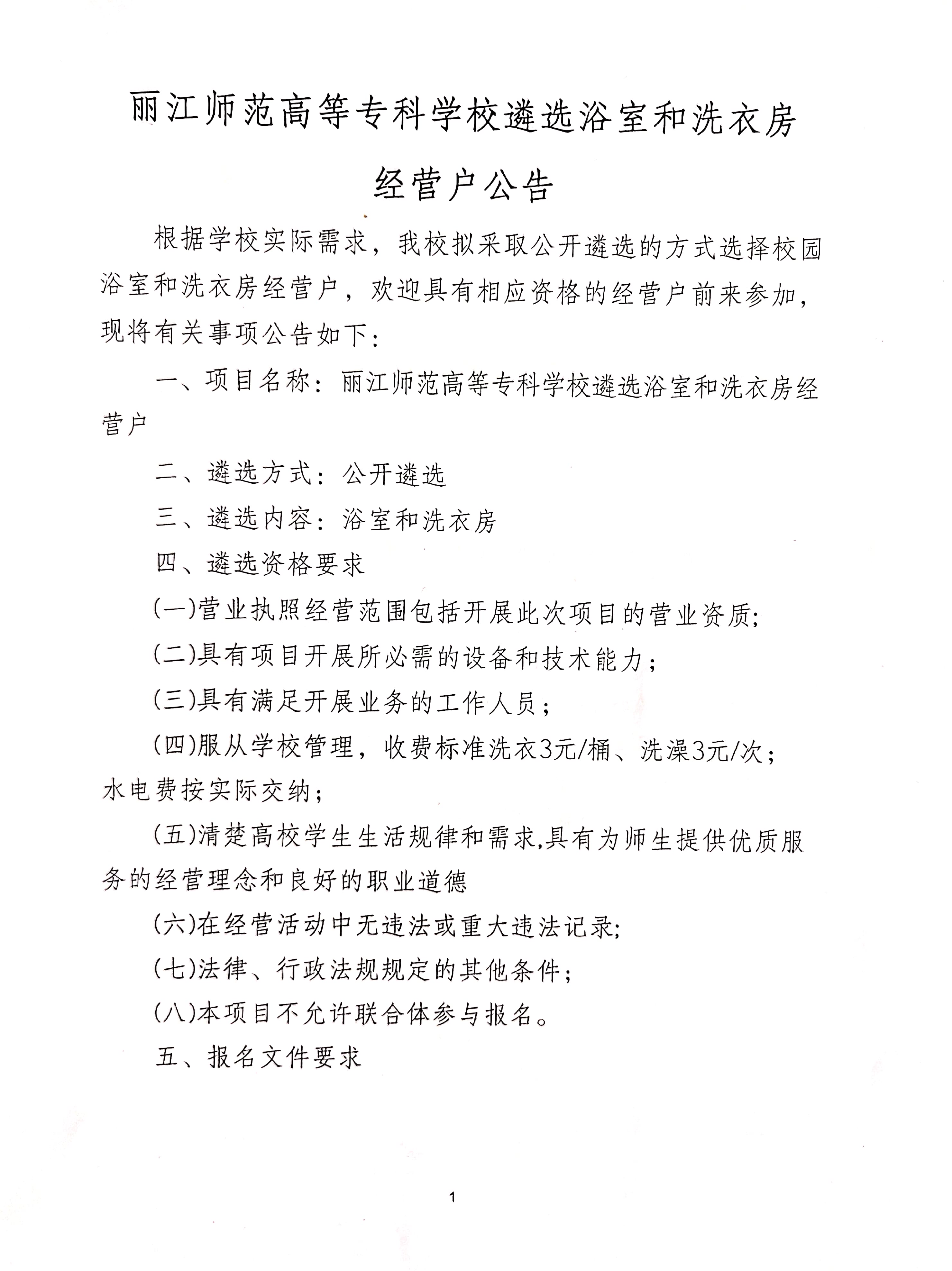 丽江师范高等专科学校遴选浴室和洗衣房经营户项目公告
