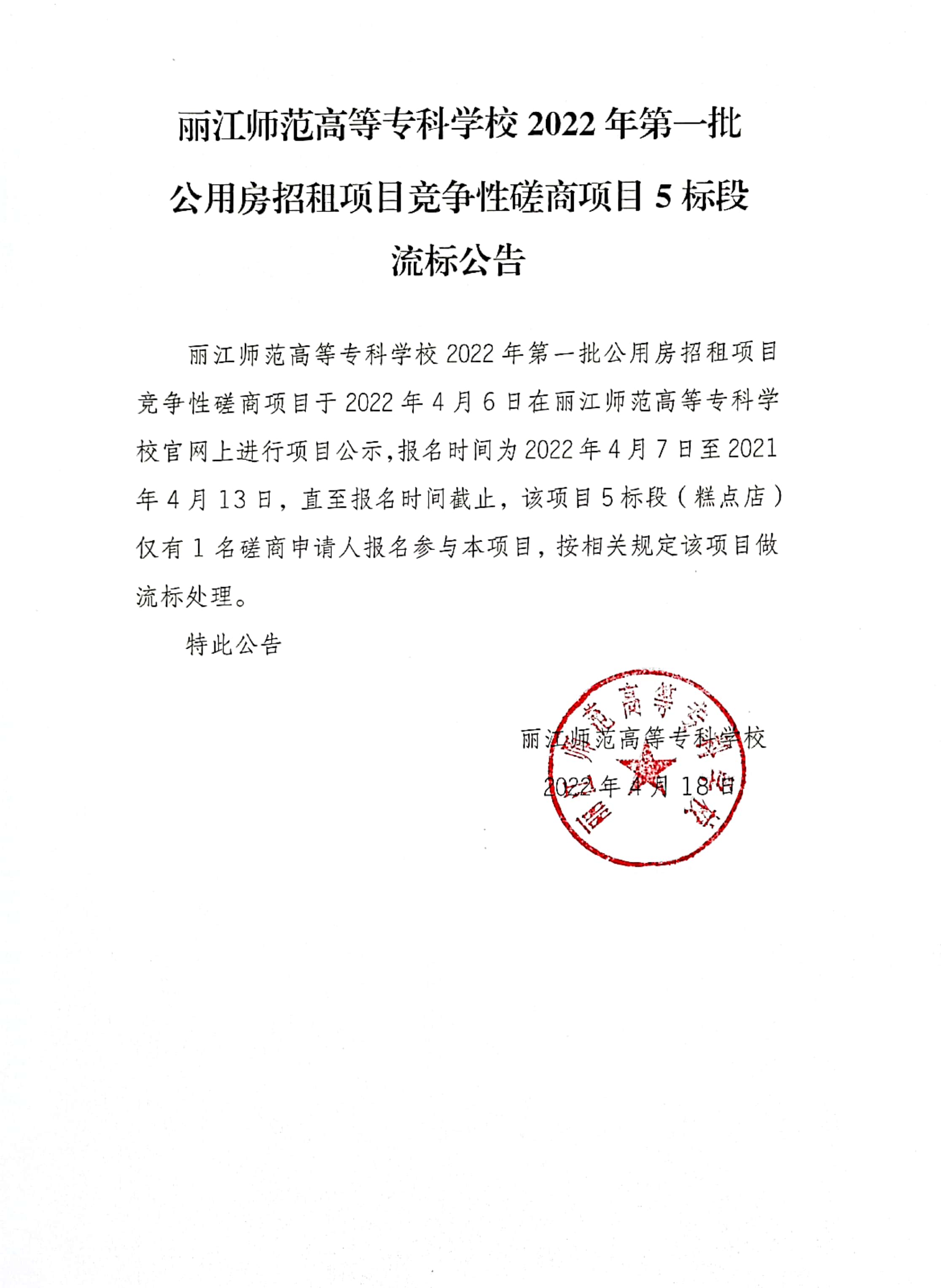 丽江师范高等专科学校2022年第一批公用房招租项目竞争性磋商项目5标段流标公告