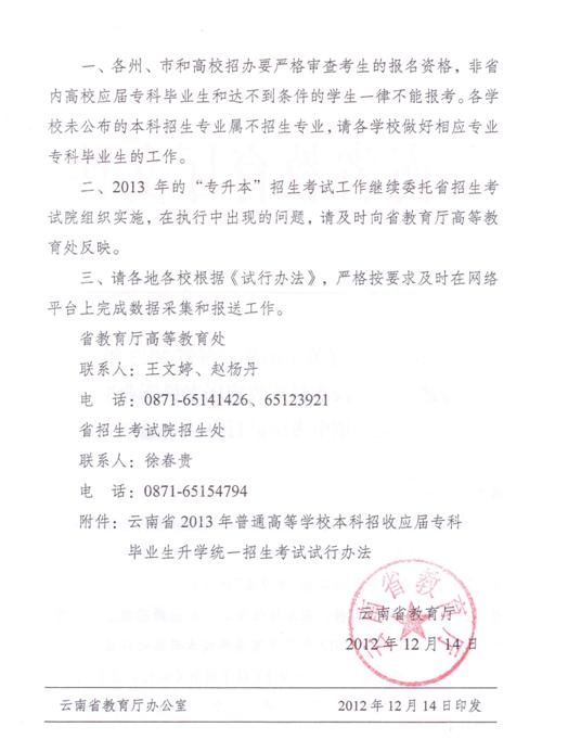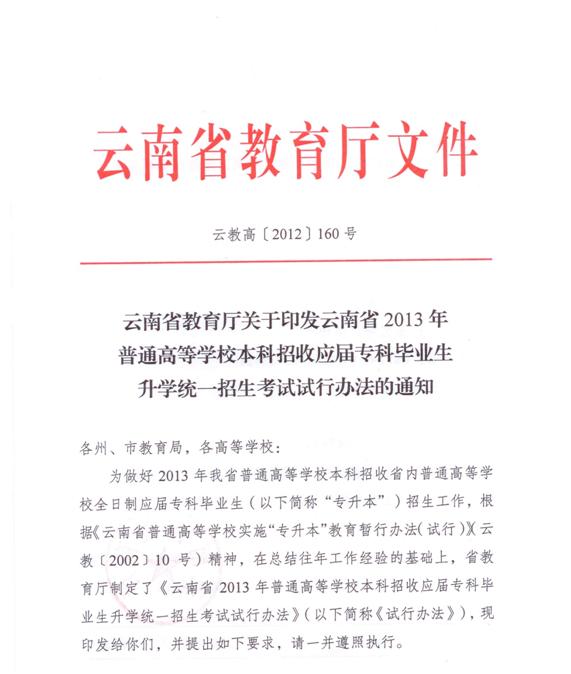 云南省2013年普通高等学校本科招收应届专科毕业生升学统一招生考试试行办法.doc