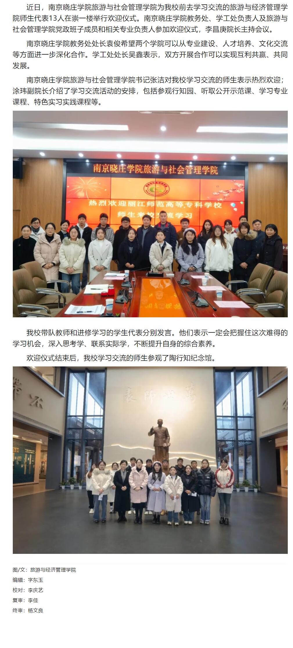 协同提质丨南京晓庄学院旅游与社会管理学院为丽江师范高等专科学校学习交流的师生举行欢迎仪式