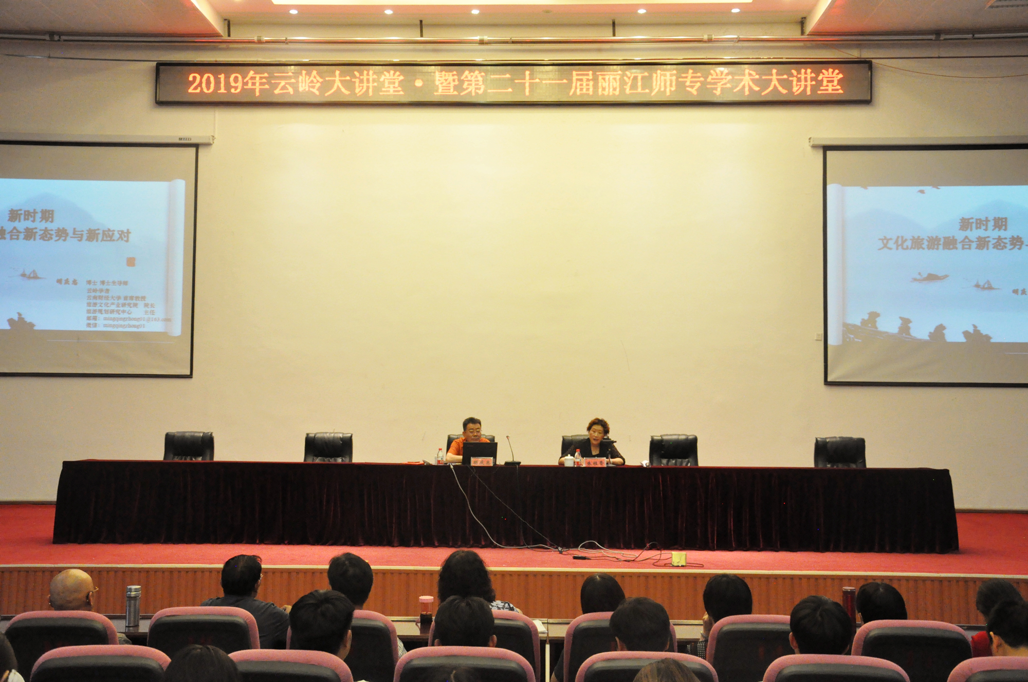 5月29日晚上,“2019年度云岭大讲堂·暨第二十届丽江师范高等专科学校学术讲坛”在bat365官网图书馆报告厅举行。云南财经大学产业研究院院长、博士生导师明庆忠教授作了题为“新时期文化旅游融合新态势与新应对”的专题讲座,国际旅游与工商管理学院500余名师生聆听了讲座。讲座由学校朱桂香副校长主持。