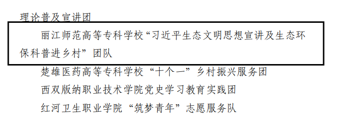 根据10月14日共青团云南省委 云南省学生联合会联合下发的《关于2022 年云南省大中专学生志愿者暑期文化科技卫生“三下乡” 社会实践活动的通报》,学校马克思主义学院2022年暑期“三下乡”社会实践团队——“习近平生态文明思想宣讲及生态环保科普进乡村”团队被评为云南省 2022 年“三下乡”社会实践活动优秀团队。