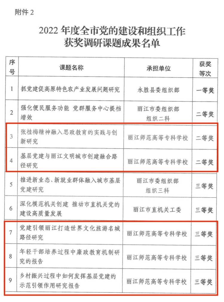 近日,市委组织部发布《关于通报表扬2022年度全市党的建设和组织工作重点调研课题获奖成果的通知》,通报表扬《张桂梅精神融入思政教育的实践与创新研究》等15篇优秀调研课题成果,其中学校2项课题成果荣获二等奖、3项成果荣获三等奖。