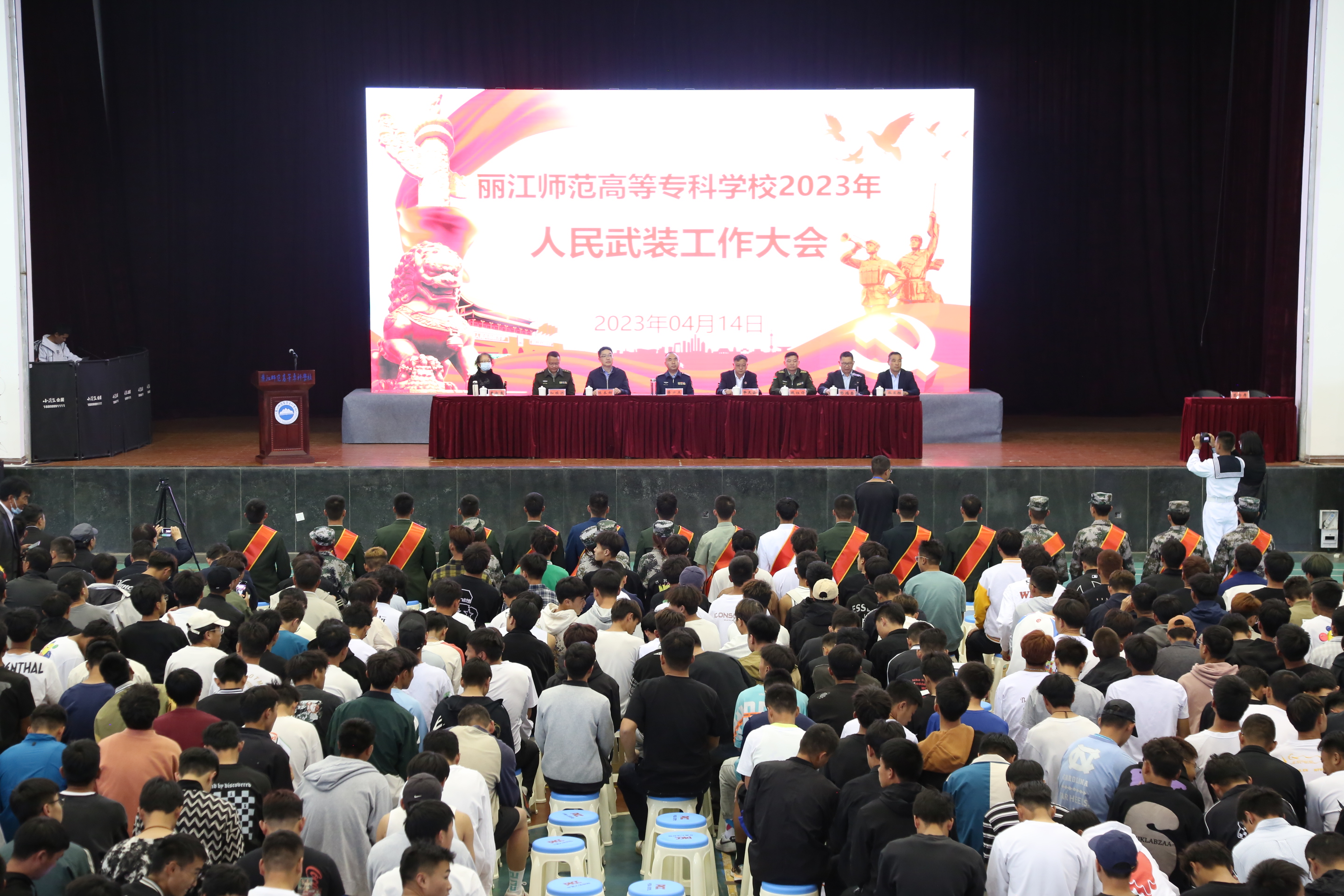 4月14日下午,学校2023年人民武装工作大会在体育馆顺利召开。丽江市委常委、丽江军分区政治委员薛少杰大校,丽江军分区动员处处长、市征兵办公室副主任魏祖锋上校,丽江市古城区武装部副部长和续洪中校,学校党委书记毕天云,党委副书记、校长陈本辉,党委副书记彭鸿昌,党委委员、纪委书记李淑良,党委委员、副校长张兰胜出席大会。会议由彭鸿昌主持。