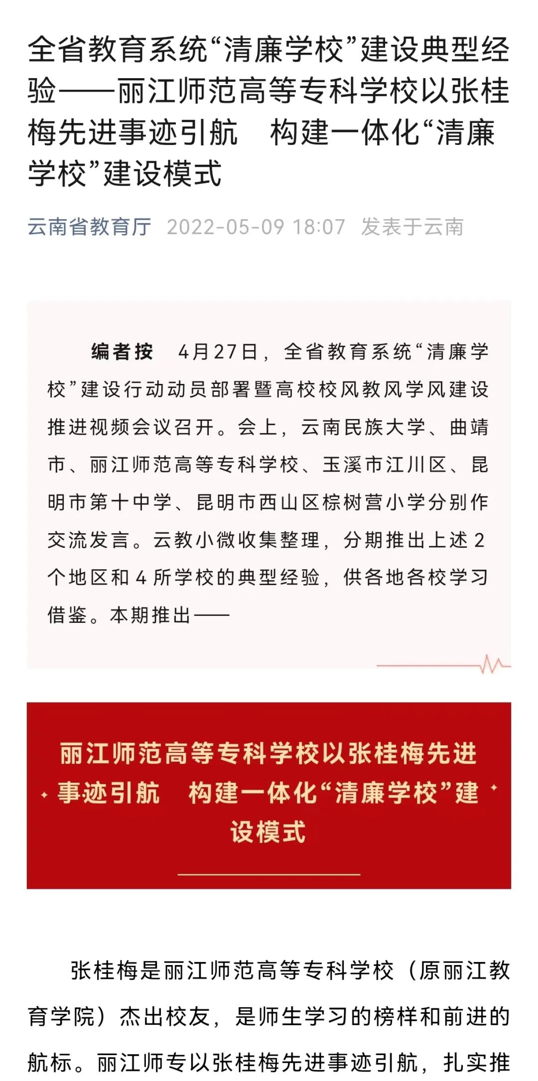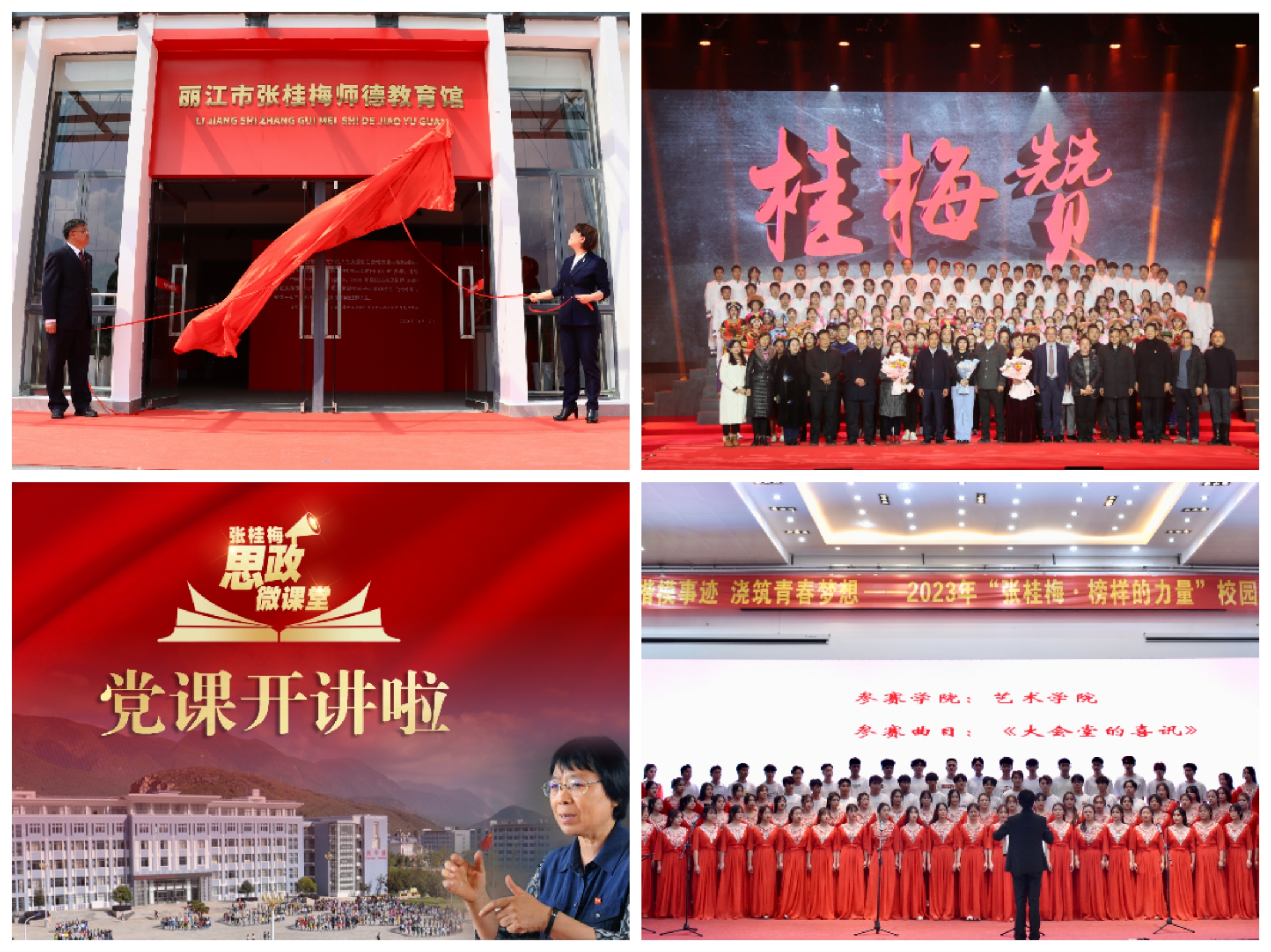 桂梅精神人人践行。以学习弘扬杰出校友张桂梅先进事迹为主题,用活丽江市张桂梅师德教育馆,创演大型民族歌剧《桂梅赞》,打造“张桂梅思政微课堂”和“张桂梅思政大讲堂——丽江师专分课堂”,举办“张桂梅——榜样的力量”校园艺术周系列活动,开展张桂梅先进事迹集中宣传月活动,建设张桂梅思政专题网站,大力弘扬高尚师德、汲取榜样力量,形成“一馆一剧两课堂、一周一月一网站”的多方位育人模式。原创民族歌剧《桂梅赞》首演获得圆满成功,在2022年“读懂中国”活动中获最佳舞台剧奖,荣获教育部2023年度高校思想政治工作质量提升综合改革与精品建设项目。《歌剧〈桂梅赞〉创演》被列入云南省第二批社科普及创新项目。推出《张桂梅思政微课堂》《身边的党代表——张桂梅》等思政教学资源和主题宣传片。