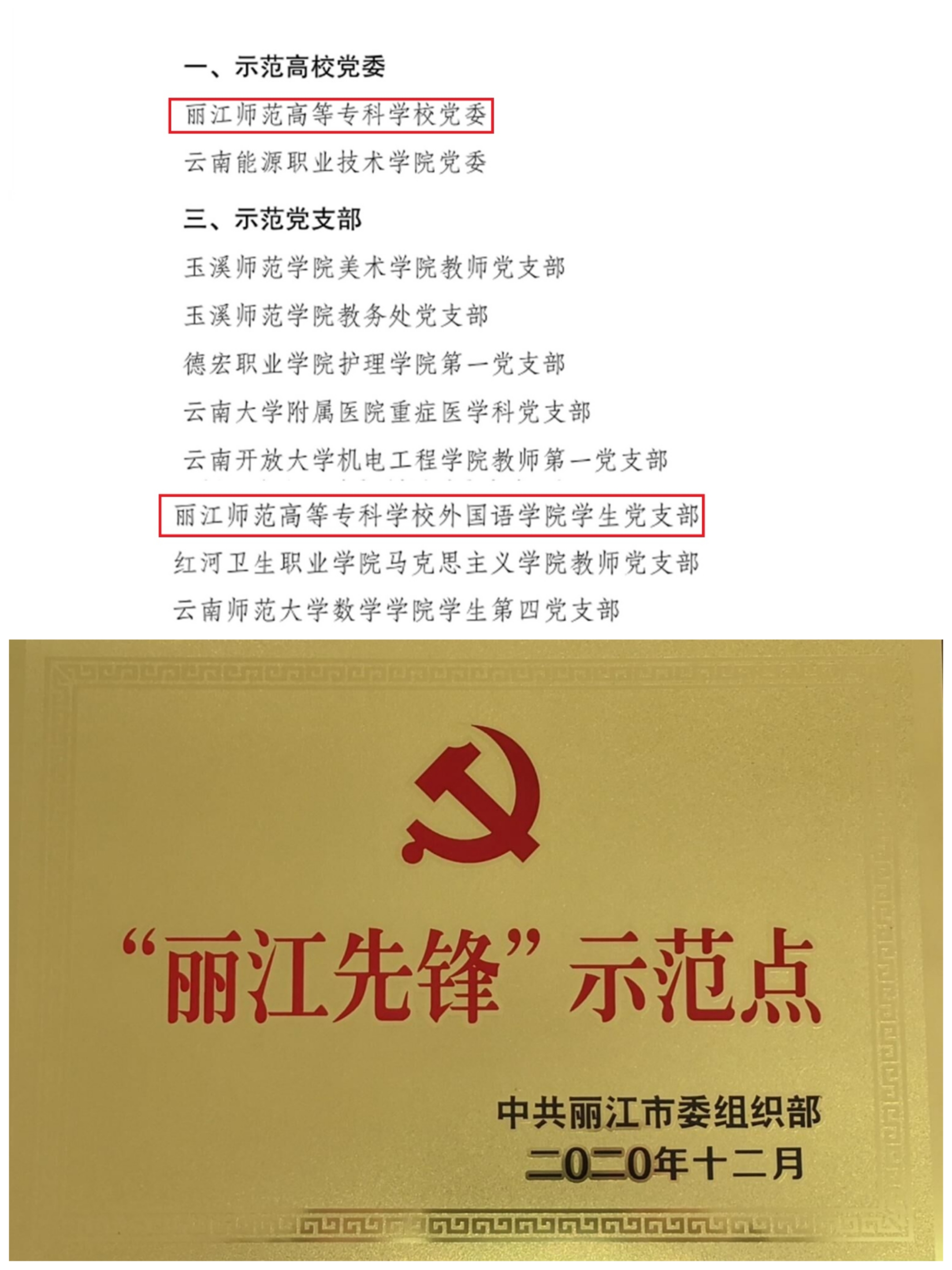 坚持组织建设为基。构建横向到边、纵向到底的组织建设体系。2020年学校党委被评为“丽江先锋”示范点。1个党支部被教育部评为“全国党建工作样板支部”。2021、2022连续两年党委书记抓基层党建工作述职评议考核综合评价为“好”。学校党委选树为云南省高校第四批“一流党建”示范高校党委,1 个党总支、6 个党支部被选树为“云南省高校创建一流党建示范党组织”。1个党总支被确定为“丽江先锋”示范点十佳典型案例推广基层党组织,1个党支部被评为丽江市先进基层党组织,4个党支部被命名为丽江市规范化建设示范党支部。学校工会和2个学院被列入丽江市2022年“党建带工建 工建服务党建”示范点。