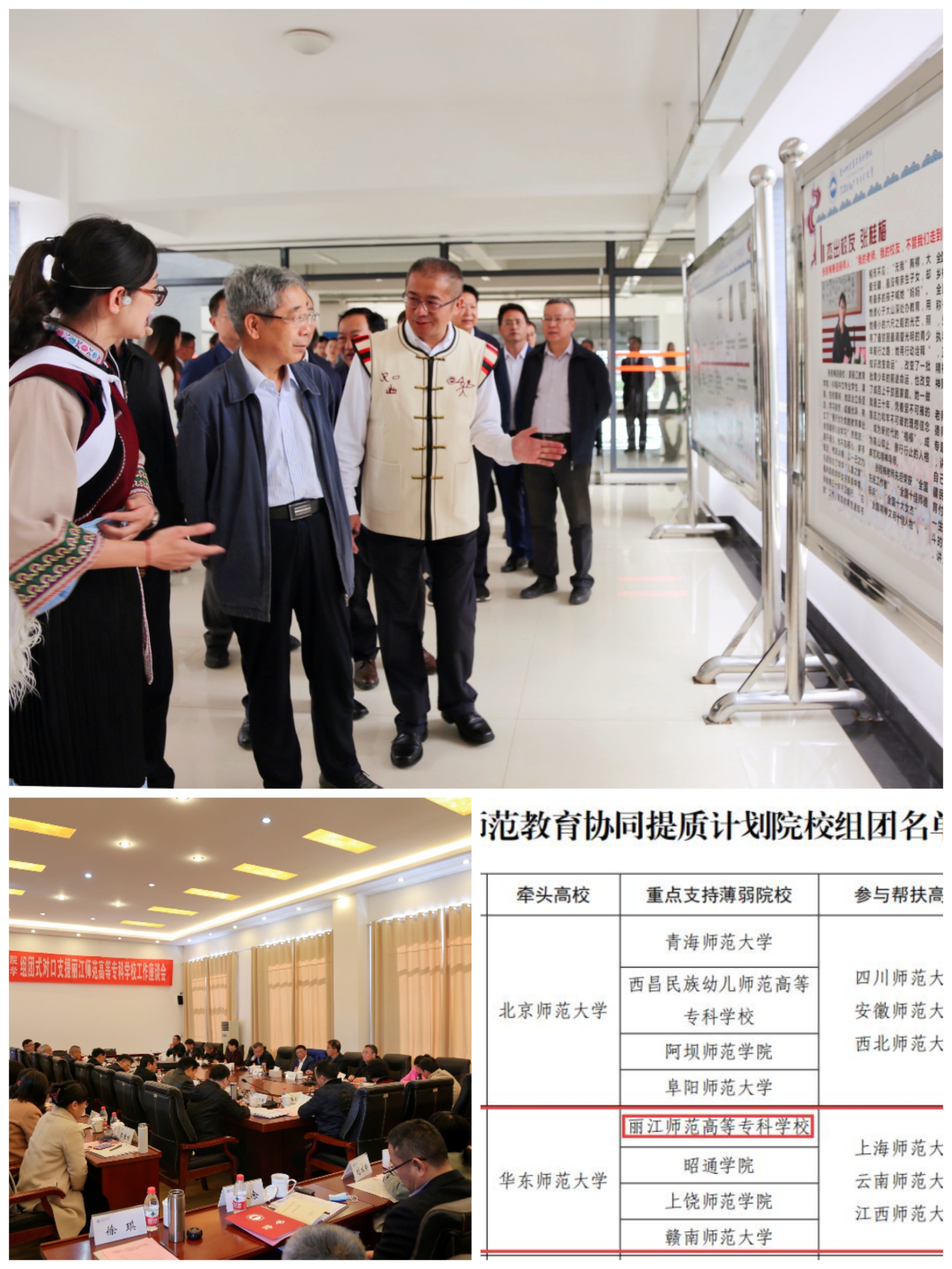 协同提质促发展。2020年10月,教育部教师工作司协调华东师范大学、南京晓庄学院、长沙师范学院、云南师范大学四校组团式对口支援丽江师专,探索形成“1+3+1”的对口支援模式。2022年4月,学校成功入选教育部“师范教育协同提质计划”重点支持院校,以“1+M+N”的组团形式,由华东师范大学牵头,上海师范大学、云南师范大学、江西师范大学参与,共同支持学校建设发展。增强社会服务能力,全力助推地方经济社会高质量发展。