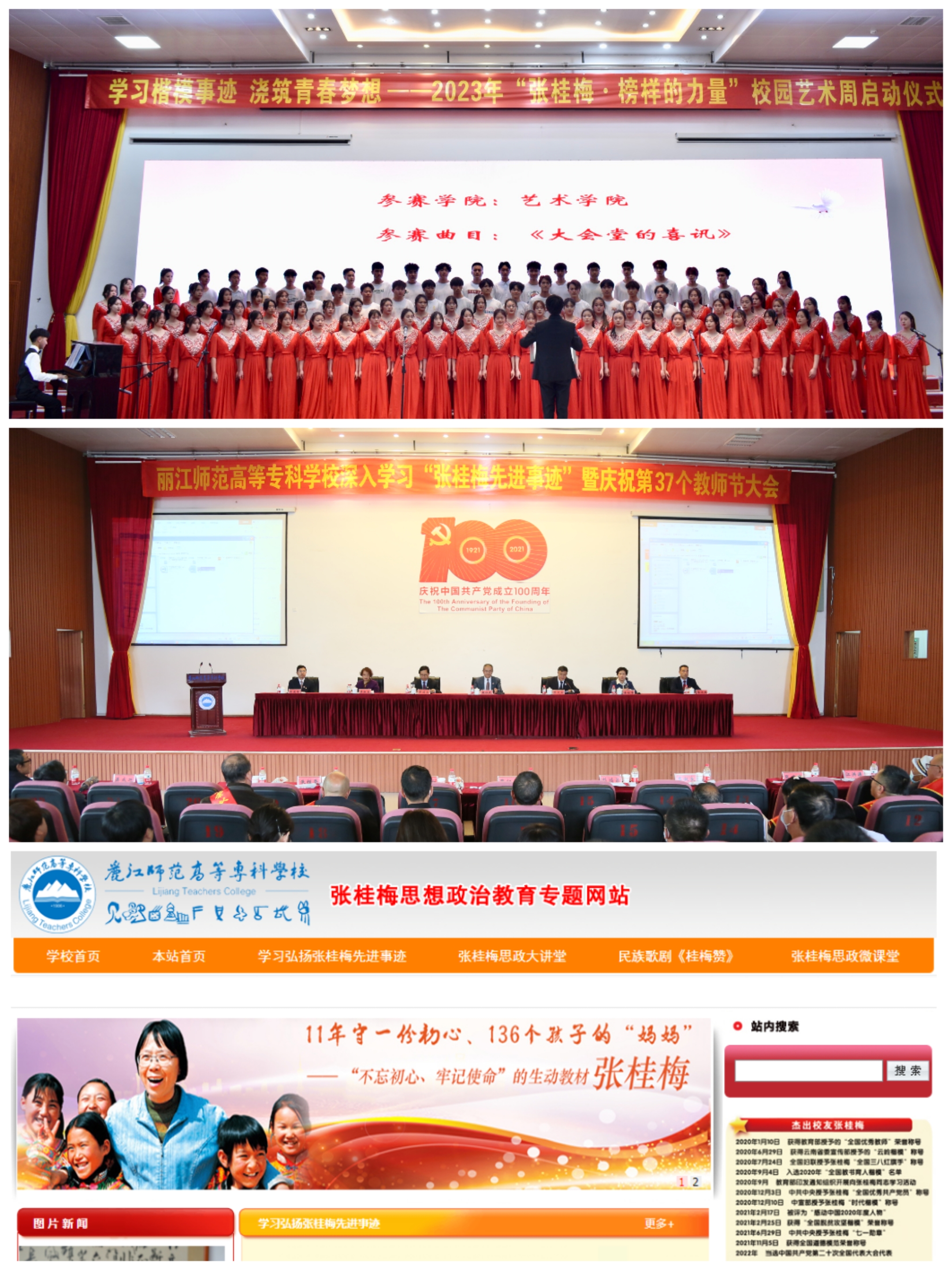 建设张桂梅思政专题网站。学校在官网主页建设有“张桂梅思政”专题网站,设有“学习张桂梅先进事迹”“张桂梅思政大讲堂”“民族歌剧《桂梅赞》”“张桂梅思政微课堂”等模块,同时上传《张桂梅思政微课堂》《身边的党代表——张桂梅》《张桂梅老师寄语丽师人》等视频资源,旨在通过网络的形式大力宣传学校学习弘扬杰出校友张桂梅先进事迹的典型经验和做法,讲好张桂梅老师故事,讲好丽师具体实践,不断扩大舆论影响力。
