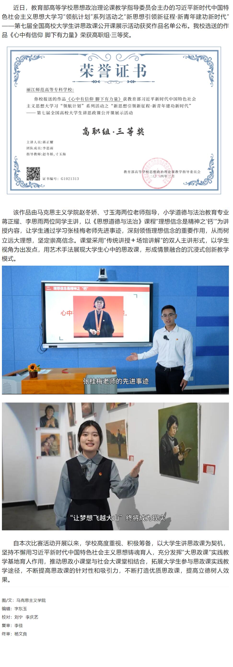 喜讯 | 学校作品在第七届全国高校大学生讲思政课公开课展示活动中获高职组·三等奖