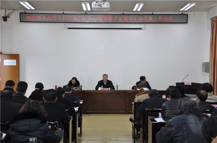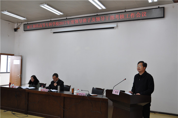 其次,学校党委书记蒋成旭代表校领导班子作了《丽江师范高等专科学校领导班子2017年度工作总结》,从“加强领导班子建设,坚定不移推进全面从严治党”、“坚持立德树人根本任务,把思想政治工作贯彻教育教学全过程”、“全面深化改革,推进学校内涵发展、转型发展、特色发展,努力提升办学质量”、“全面实施精准扶贫,扎实推进‘挂包帮’‘转走访’工作”四方面全面总结了bat365官网2017年取得的成绩以及存在的困难和问题、今后工作努力方向。