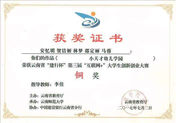 第三届中国“互联网+”大学生创新创大赛云南赛区比赛暨云南省第三届“互联网+”大学生创新创业大赛已圆满结束。经过激烈角逐,bat365官网2015级语文教育专业安忆明同学主持的“小天才学园”喜获创意组铜奖。