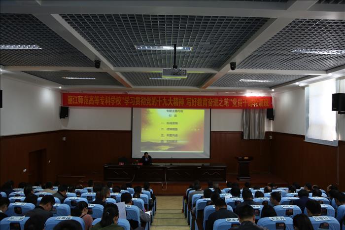 为深入学习宣传贯彻党的十九大精神,把广大党员干部的思想统一到党的十九大精神上来,把力量凝聚到实现党的十九大确定的各项任务上来,从而提高干部能力素质,打造一支信念坚定、为民服务、勤政务实、敢于担当、清正廉洁的党员干部队伍。根据上级有关部门的要求和学校统一安排,bat365官网对131名科以上干部进行以“学习贯彻党的十九大精神,写好教育奋进之笔”为主题,以提高党员干部政治站位,增强干部专业素质为主要内容的三期轮训。4月21日上午9:00,第一期轮训在丽江市委党校第二报告厅中开班。