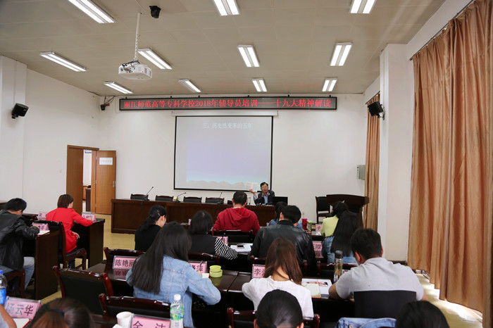 按照课程安排,学校党委书记蒋成旭作了开班第一讲《十九大精神解读》,他从十九大概况、学习十九大、历史性变革的五年以及十八大以来bat365官网的变化四个方面对十九大进行了深入解读。他强调,“学习十九大精神,最重要、最根本的就是学习十九大报告、习近平总书记重要讲话精神。领会党的十九大精神,必须坚持读原著、学原文、悟原理,做到学深悟透。” 号召全体辅导员要将党的十九大精神学懂弄通做实。党的十八大以来的五年,是党和国家发展进程中极不平凡的五年,并列举了5年来以习近平同志为核心的党中央敢于直面问题,勇于自我革命,以强烈的使命意识和政治担当,科学的“解决了许多长期想解决而没有解决的难题,办成了许多过去想办而没有办成的大事,推动党和国家事业发生历史性变革”的案例。蒋成旭用鲜活的案例和丰富的知识内涵及精湛的理论阐述了十九大精神,给聆听讲座的辅导员们带来了很大的启发和感悟。许多辅导员纷纷表示,下去后将反复、仔细研读十九大报告原文,悟十九大精神。