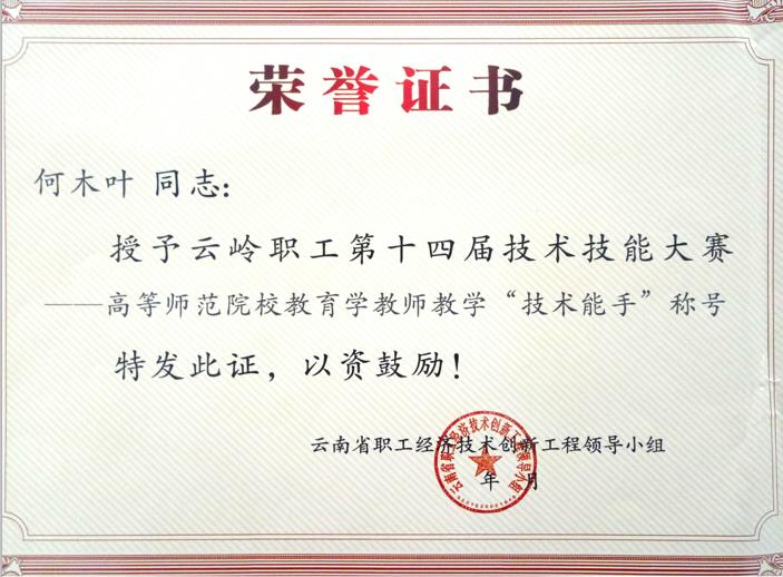 bat365官网学前教育学院教师何木叶在2017年云南省职工业务技能大赛 ——“高教社杯”高等师范院校教育学教师教学技能大赛中,成绩优异,被授予云南省总工会授予“云南省五一巾帼标兵”称号,同时被授予云岭职工第十四届技术技能大赛——“高等师范院校教育学教师教学“技术能手”称号。