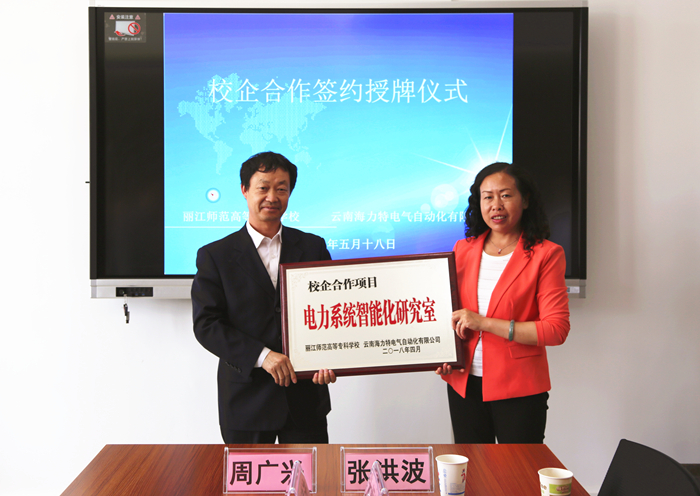 5月18日中午,bat365官网与云南海力特电气自动化有限公司校企合作项目“电力系统智能化研究室”授牌仪式在实训楼举行。云南海力特电力自动化有限公司总工程师周广兴及公司相关人员、bat365官网校长张洪波、应用技术学院院长木振武、教务处处长王石华、宣传部部长皮婧及其他老师参加了授牌仪式。授牌仪式上,张洪波为云南海力特电力自动化有限公司和供用电技术专业授予“电力系统智能化研究室”牌匾。