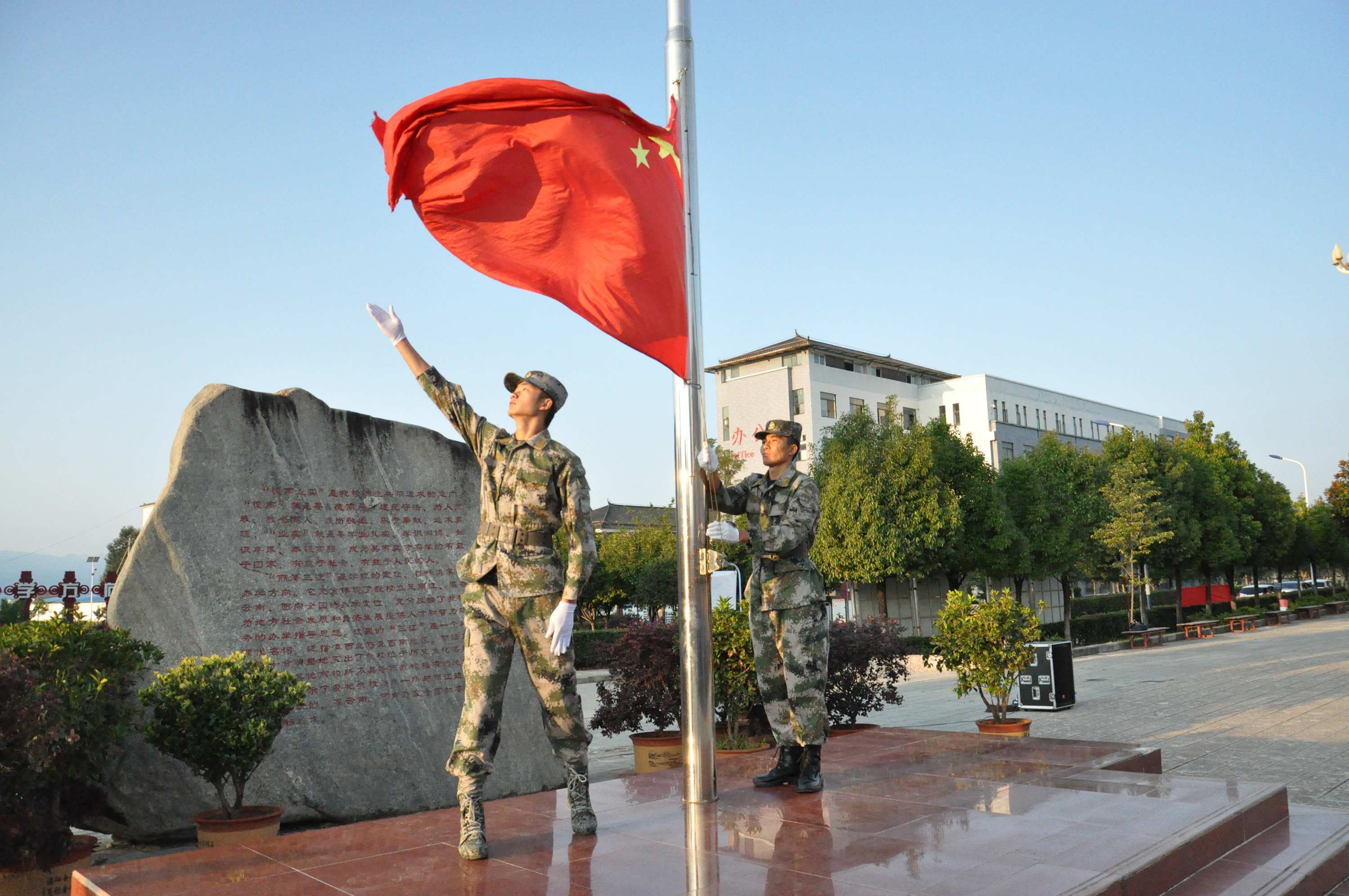 7点30分,升国旗仪式正式开始,身着迷彩服的国旗护卫队队员精神抖擞,迈着整齐、有力的步伐护卫着鲜艳的五星红旗来到升旗台。伴随着雄壮的国歌,五星红旗冉冉升起,飘扬在学校南广场上空,现场全体师生肃然而立行注目礼,心中满怀爱国之情。