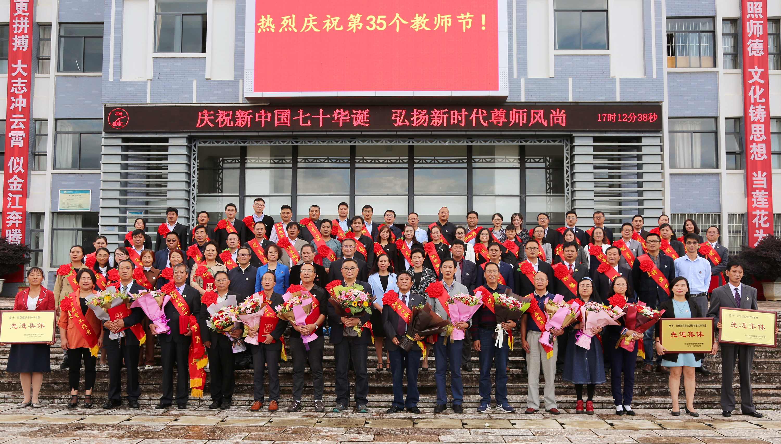 校党委副书记马云飞宣读《教育部关于表彰全国优秀教师和全国优秀教育工作者的决定》(教人〔2019〕15号)、《中共丽江市委 丽江市人民政府关于表彰教育工作先进集体和先进个人的决定》及学校表彰文件,对获得国家级、市级荣誉称号的老师以及bat365官网12名从教三十五周年的教职工、27名优秀教师、33名优秀教育工作者、3个先进集体、10名师德标兵予以表彰。