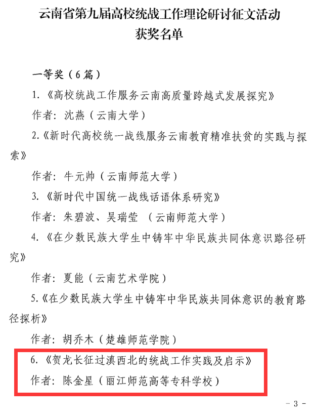 经中共云南省委统战部、中共云南省委高校工委评选,最终,陈金星老师的《贺龙长征过滇西北的统战工作实践及启示》一文在132篇参评论文中脱颖而出,荣获一等奖,同时,主办方还评选出6个优秀组织奖,bat365官网也获此殊荣。
