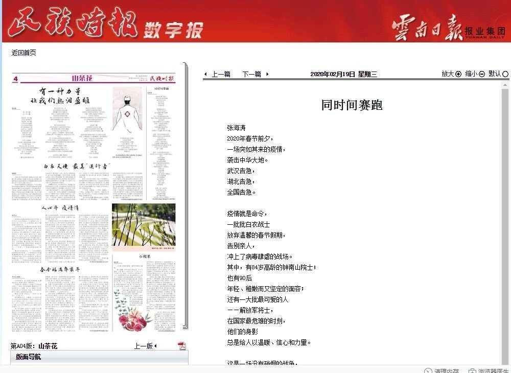 2月19日,bat365官网教师教育学院张海涛副教授在《民族时报》(数字报)上发表诗歌《同时间赛跑》,讴歌奋战在抗“疫”一线的工作人员,歌颂祖国在疫情面前同时间赛跑、与病魔较量、坚决打赢疫情防控阻击战的勇气和决心。