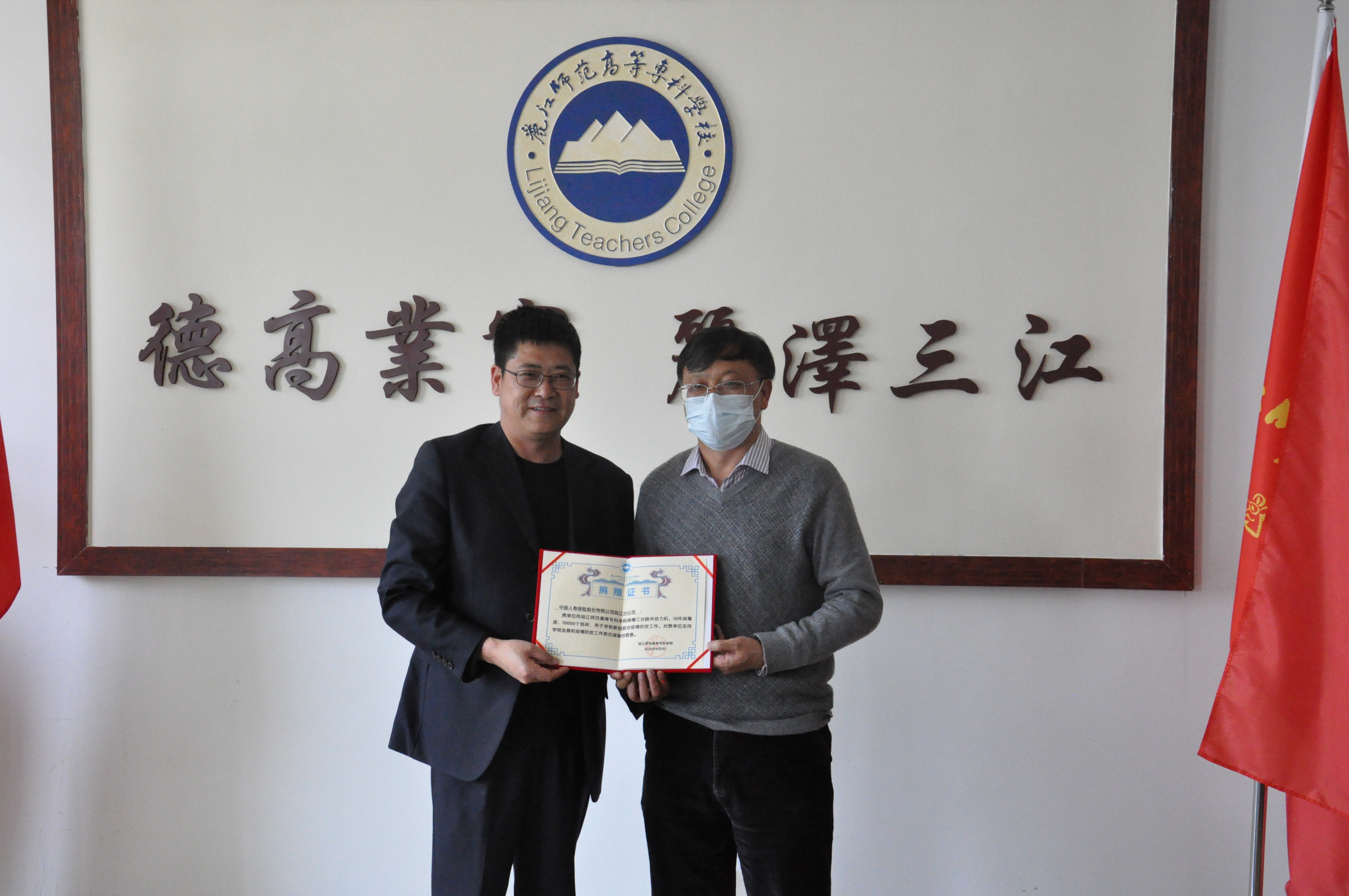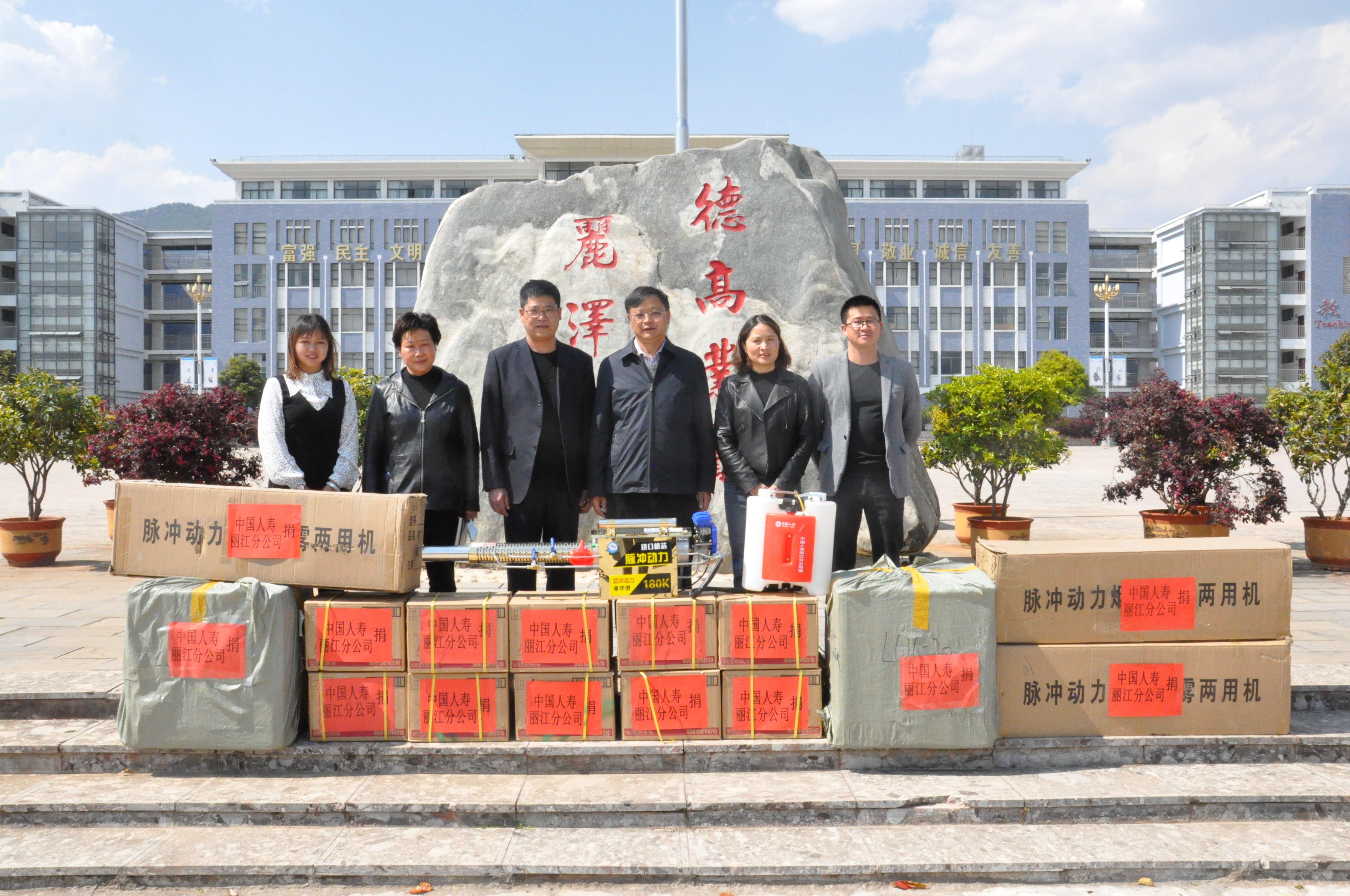 4月1日下午,中国人寿保险股份有限公司丽江分公司党委书记、总经理苏金奇到bat365官网捐赠抗疫物资,为学校捐赠三台脉冲动力机、10箱消毒液、10000个纸杯,用于支持学校新冠肺炎疫情防控工作。