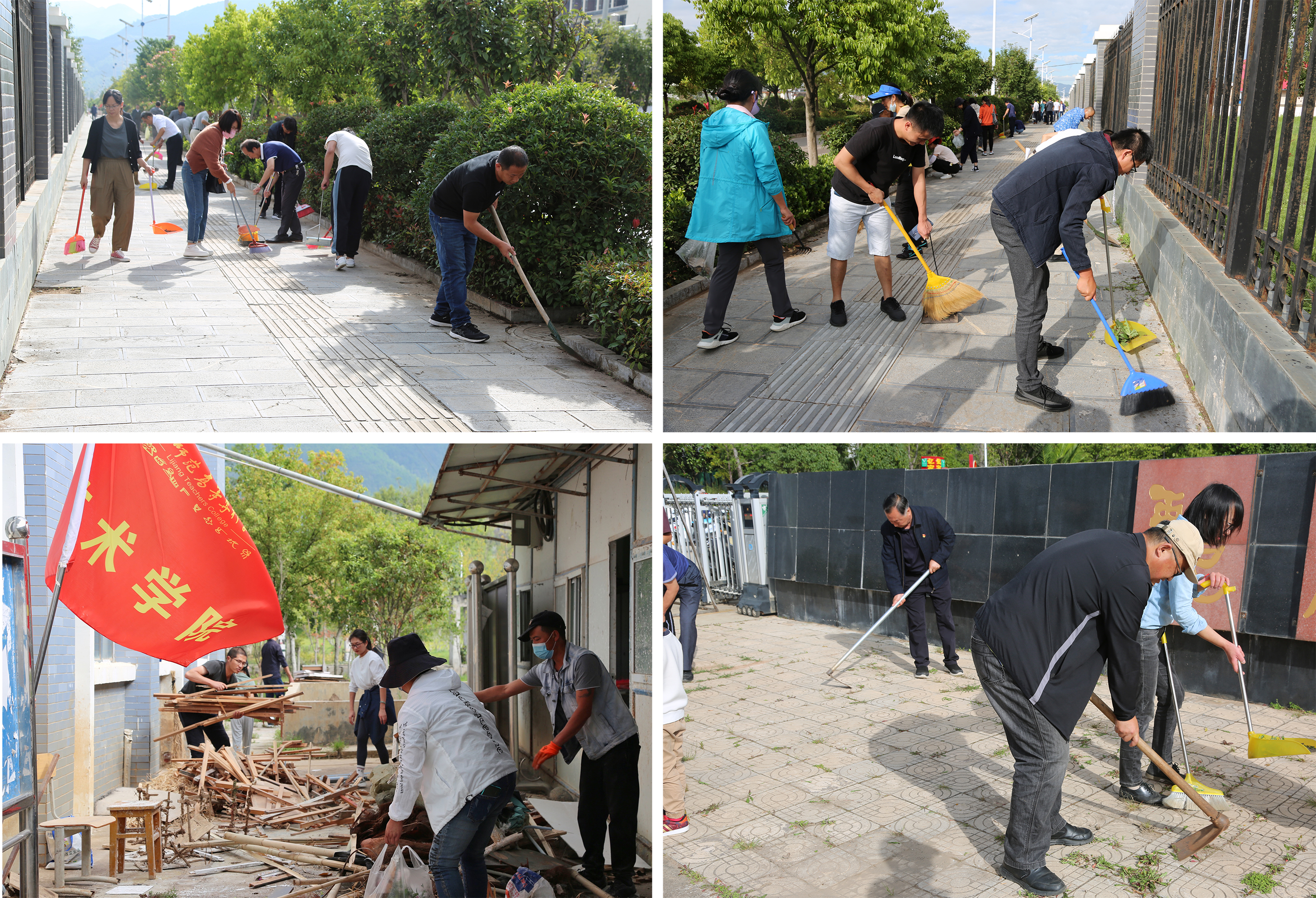 学校领导高度重视本次活动,严管理、细分工,全体教职工齐上阵。上午9时,大家自带工具来到学校南广场集合,党委副书记彭鸿昌作动员讲话,号召动员全体教职工以主人翁责任感投入到“创文”工作中,为丽江市创建文明城市和美化校园环境做出努力。随后大家根据提前划分好的区域参加义务劳动,集中清理校园周边环境,分散清理校内人行横道、教学楼、食堂、篮球场等公共区域。