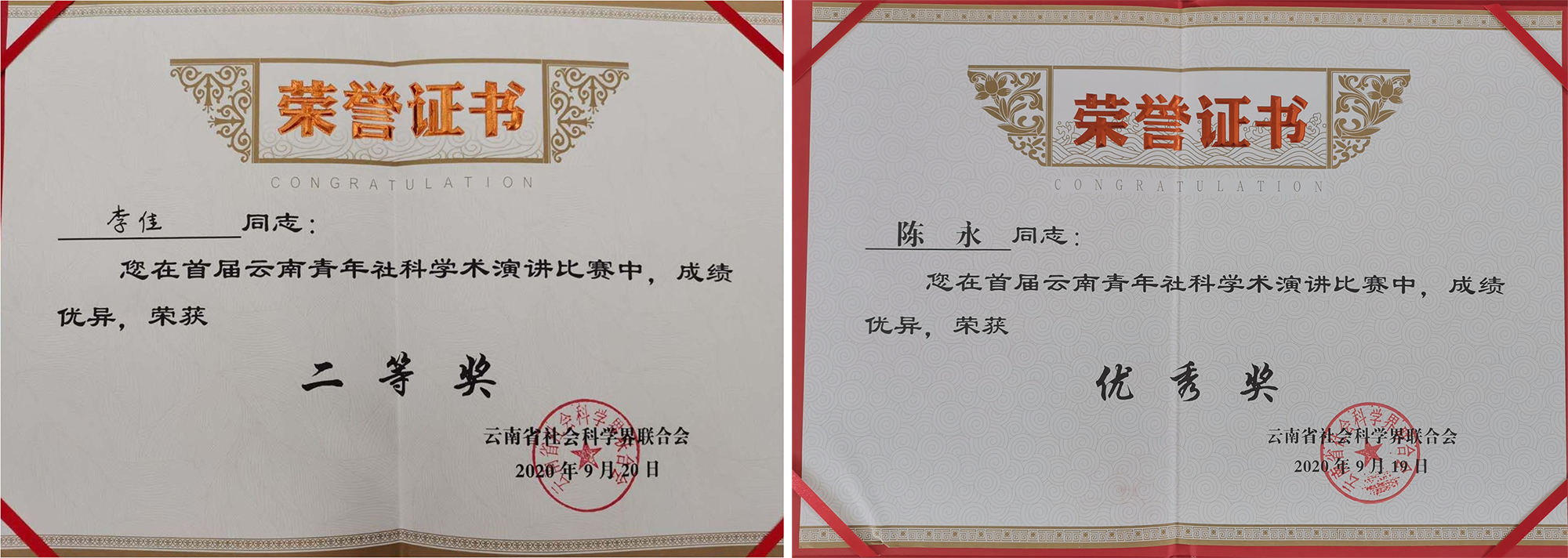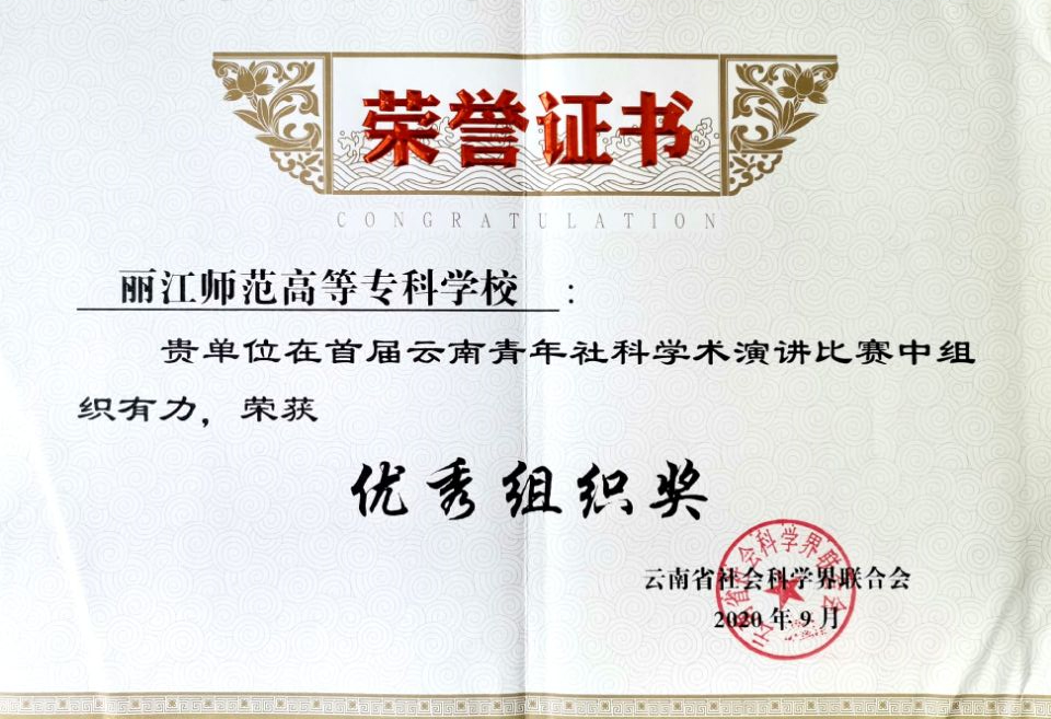 bat365官网教师教育学院青年教师李佳在云南省社科联主办的首届云南青年社科学术演讲比赛中荣获“二等奖”,国际文化交流学院青年教师陈永荣获“优秀奖”,丽江师范高等专科学校荣获“优秀组织奖”。