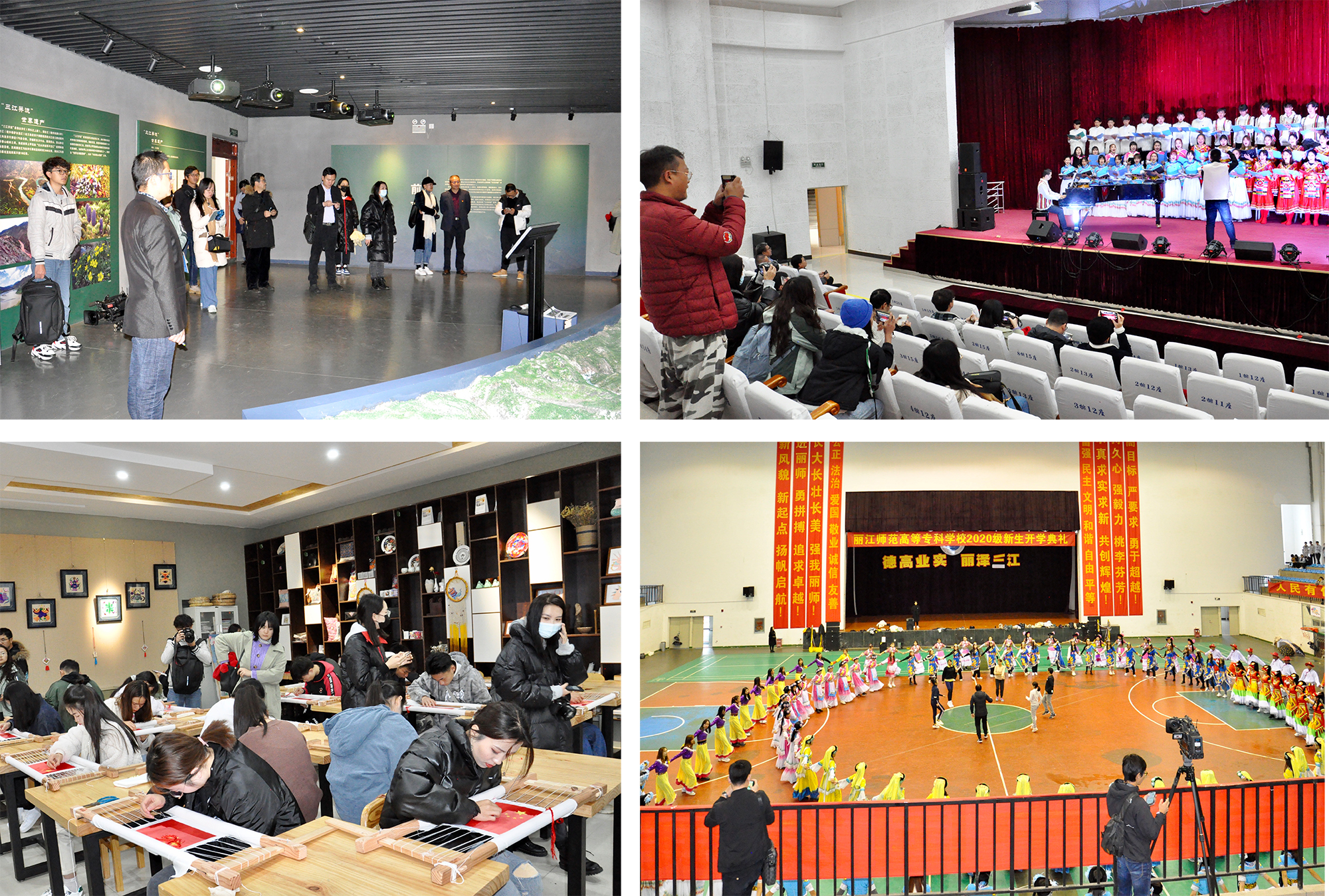 在学校党委书记张祖武、党委副书记彭鸿昌的陪同下媒体团一行实地走访了丽江师专民族团结进步示范馆、高山植物标本馆、滇西北民族艺术传承基地、民族文化宣讲实训室,观看了学校的特色课间操——民族打跳,欣赏了由bat365官网禾雨老师创作的歌曲合唱《北京有个金太阳》以及《团结花开丽江美》。