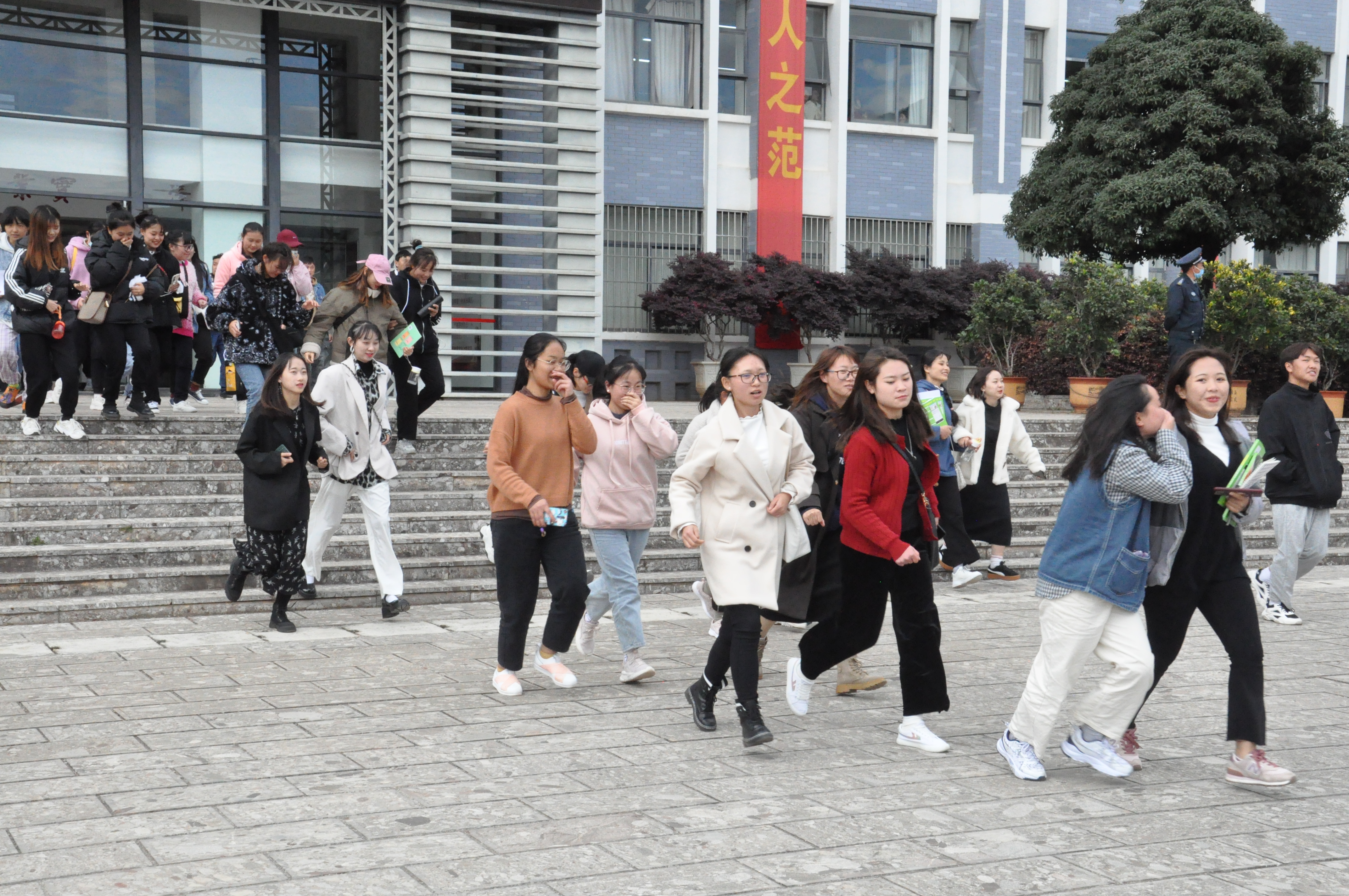 本次紧急疏散演练,模拟学校教学楼三楼某教室发生火灾。随着警报的响起,关闭电闸后,在教学楼上课的学生在老师、保安、辅导员的指挥下,沉着冷静地用双手、口罩、衣袖等捂住口鼻,沿指定路线低头弯腰,按顺序迅速、有序的撤离到安全场地集合。整个过程行动快速,井然有序,配合默契。