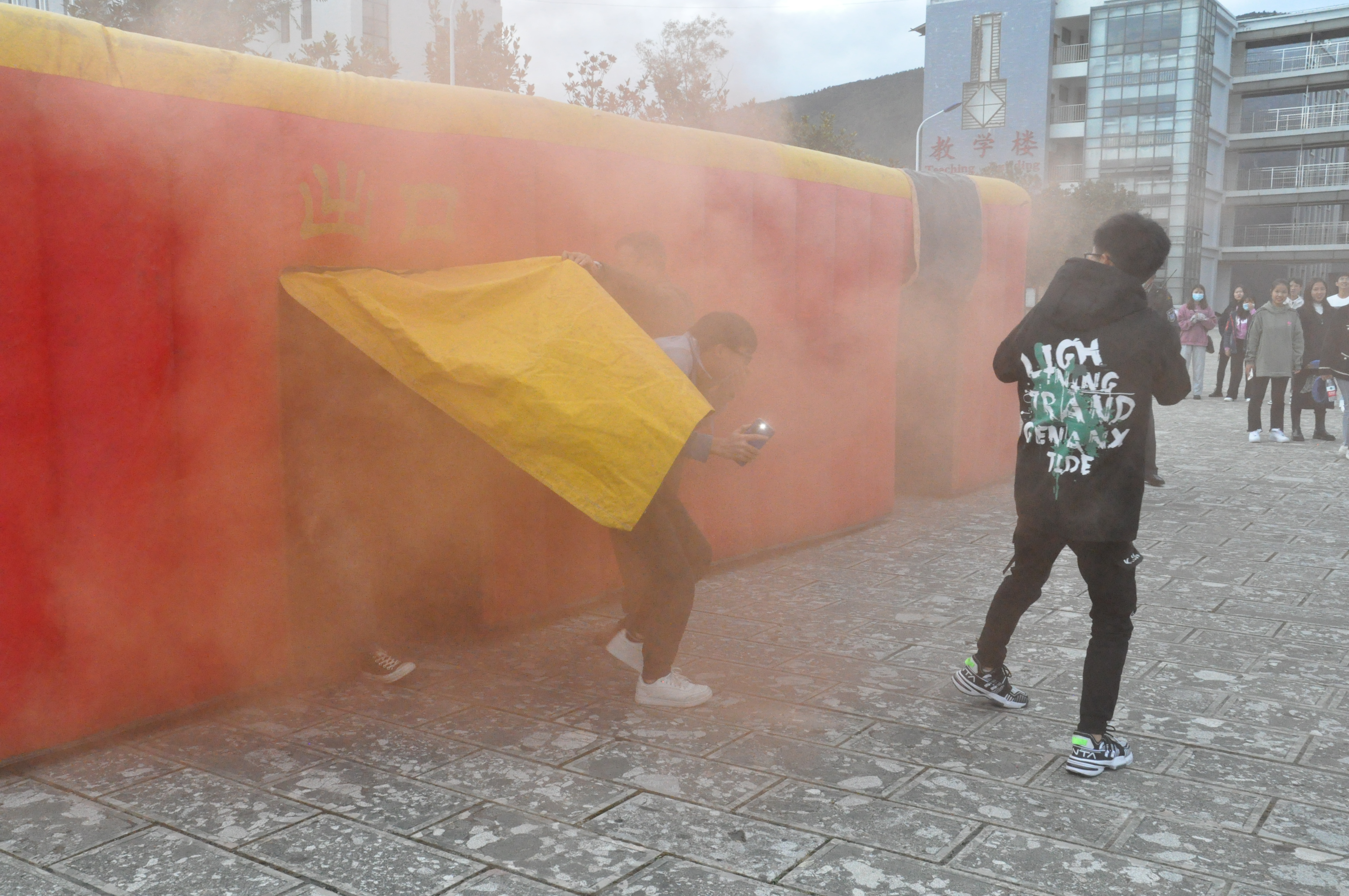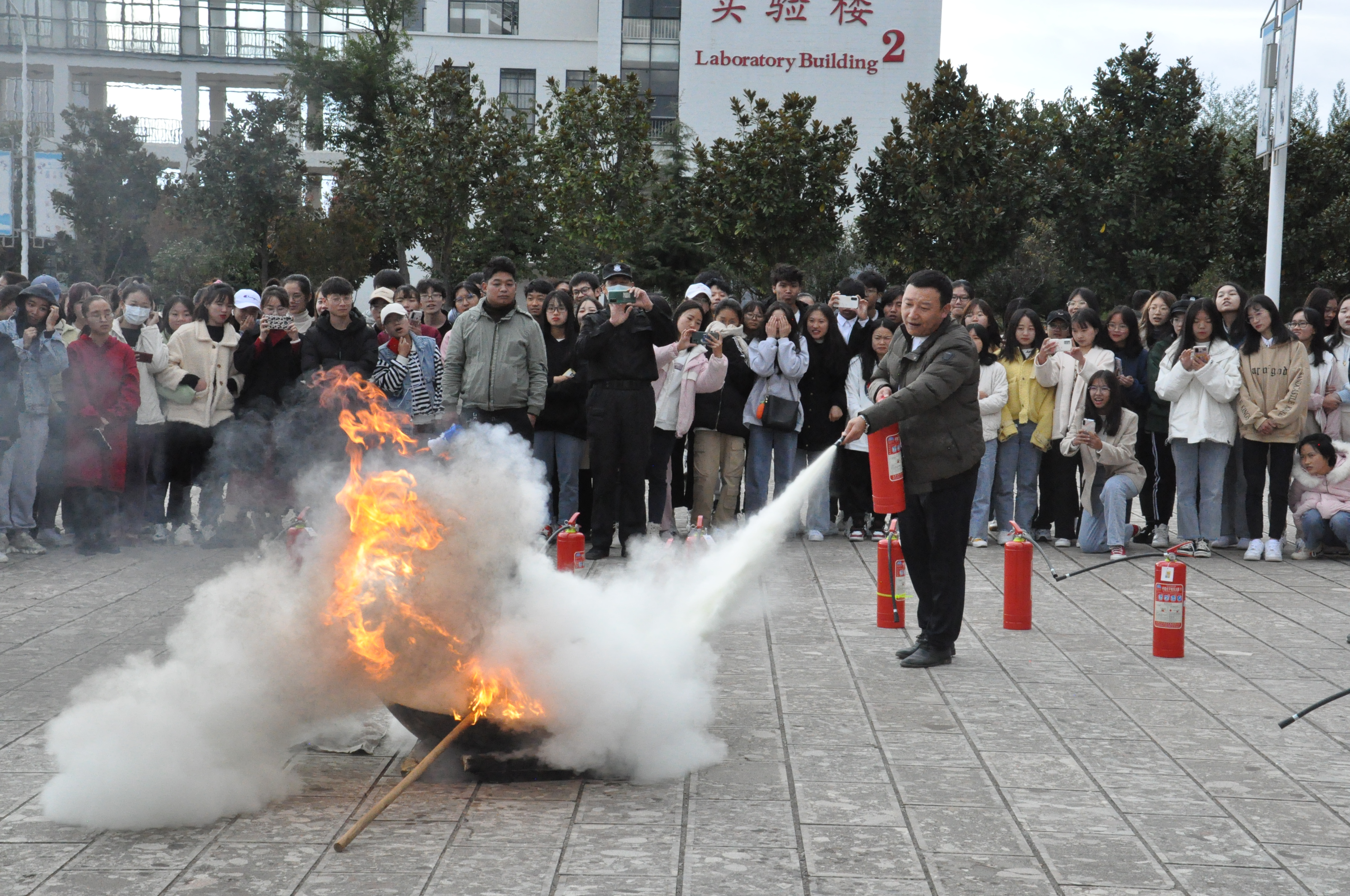 随后,昆明消安消防普及中心专业工作人员现场为师生讲授、演示几种灭火器材的使用方法和逃生技巧。同学们还进行了帐篷紧急逃生演练。帐篷内真实的模拟了火灾现场环境,内设有隔断墙,将帐篷内空分隔成迂回曲折的走道空间,为迷宫形式,两端分别设有1个进口和1个出口,进出口上设有遮光用的门帘。同学们在烟雾缭绕的帐篷内感受火灾发生时的模拟状态,按照帐篷内的标识找到正确的道路,最后顺利地从出口“逃生”。