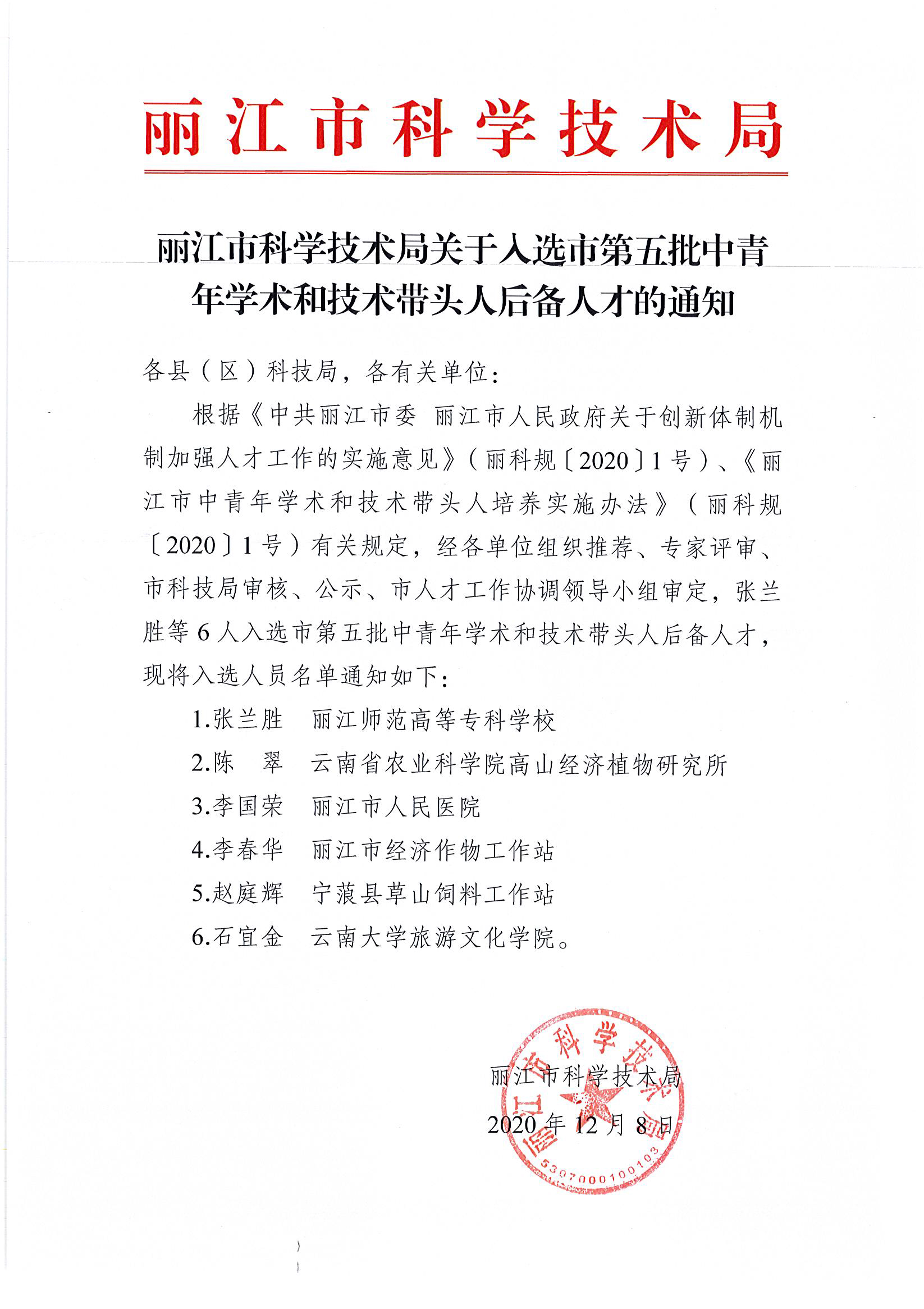 近日,丽江市科技局下发了《丽江市科学技术局关于入选第五批中青年学术和技术带头人后备人才的通知》,bat365官网张兰胜副校长入选了丽江市第五批中青年学术和技术带头人后备人才。据了解,本次后备人才项目经各单位组织推荐、专家评审、市科技局审核、公示、市人才工作协调领导小组审定,最终全市有6人入选。