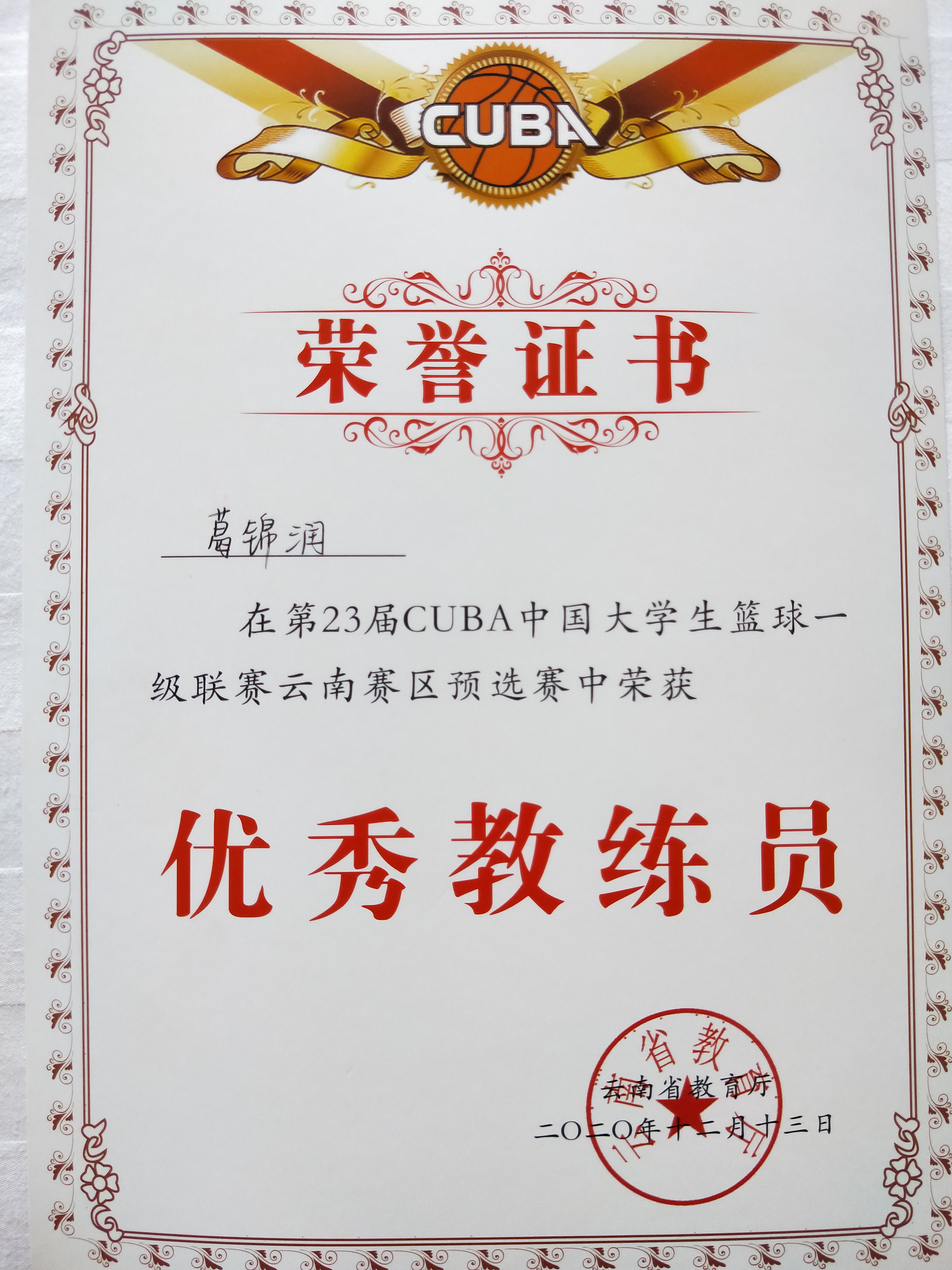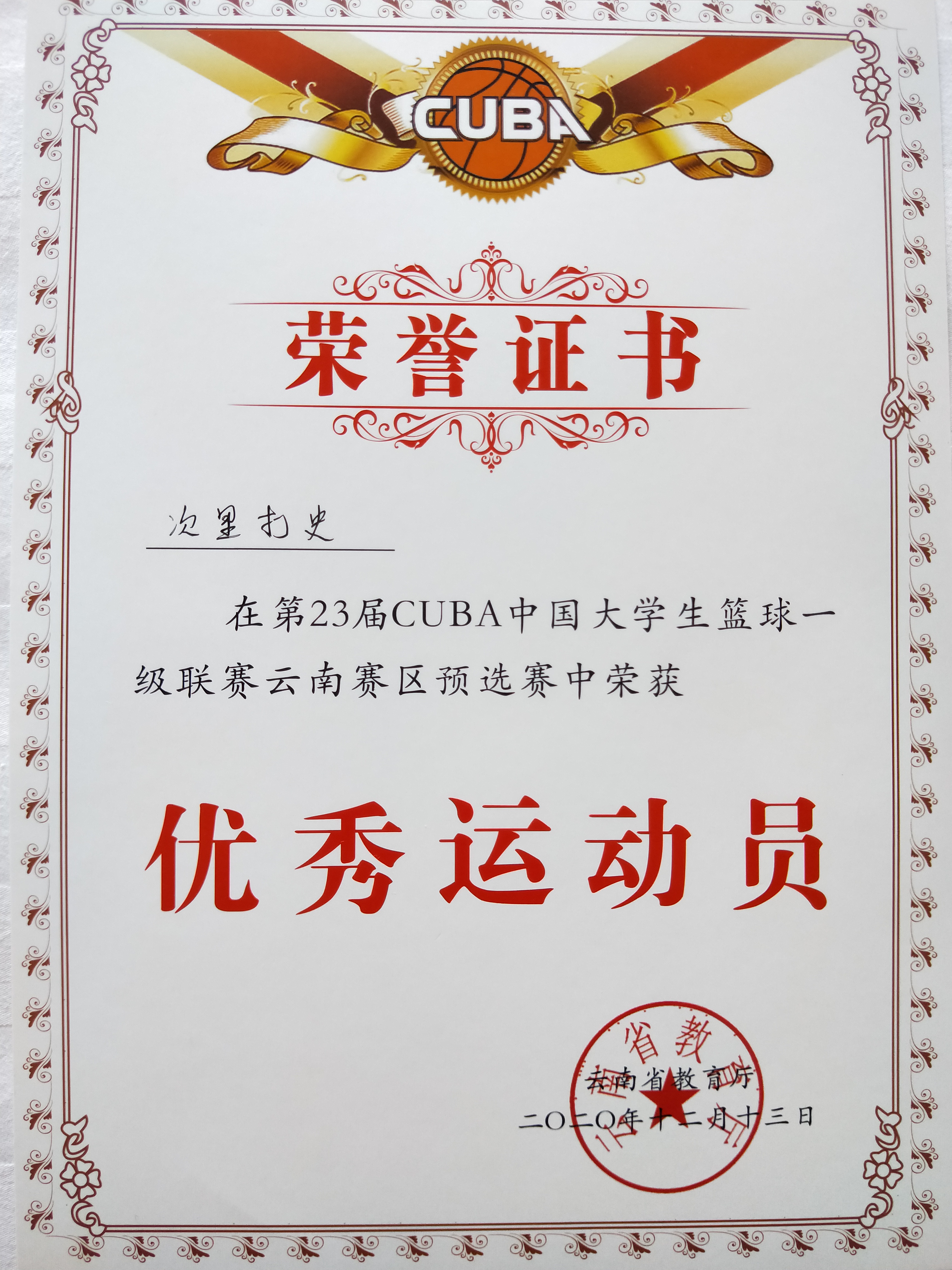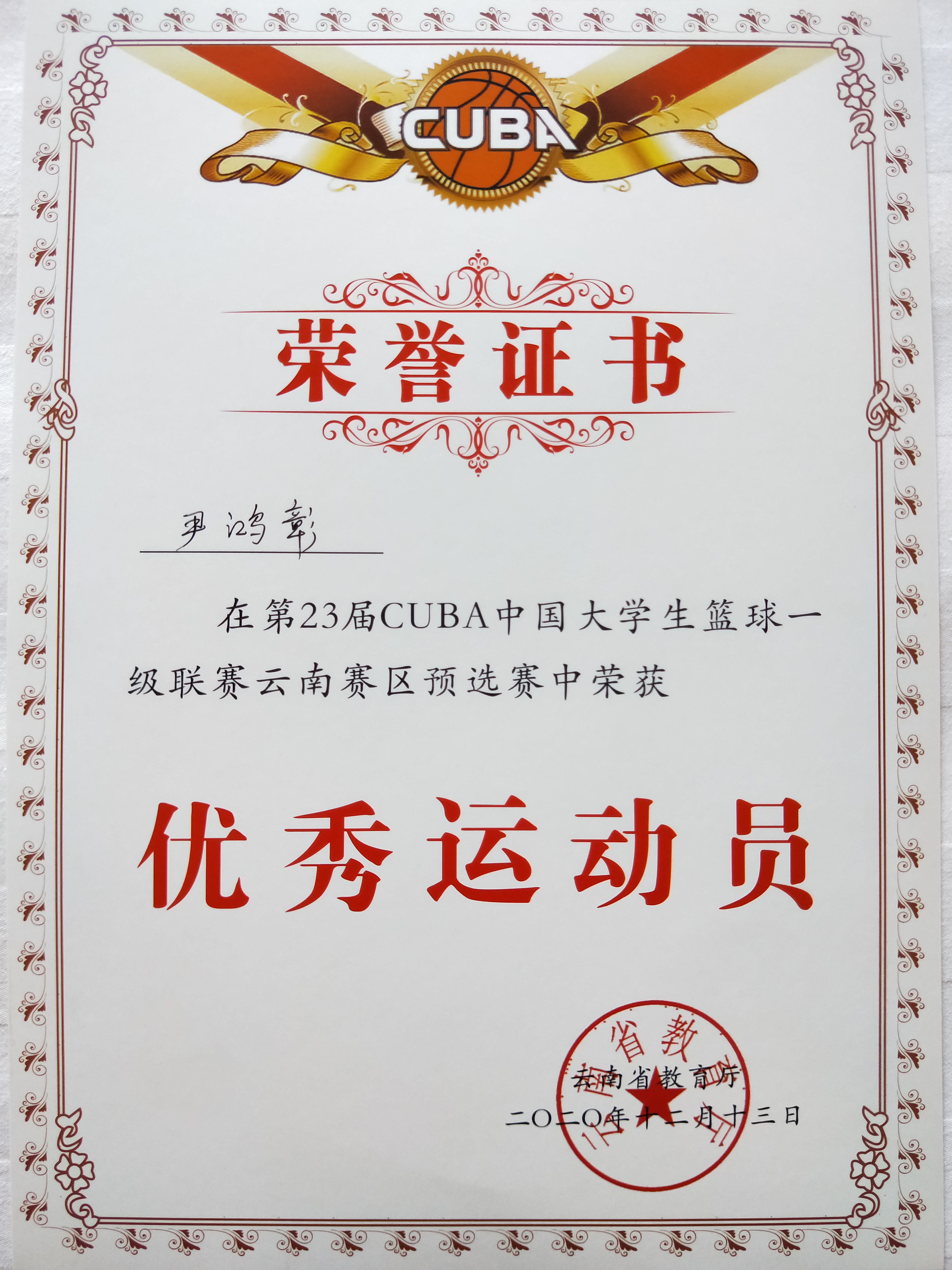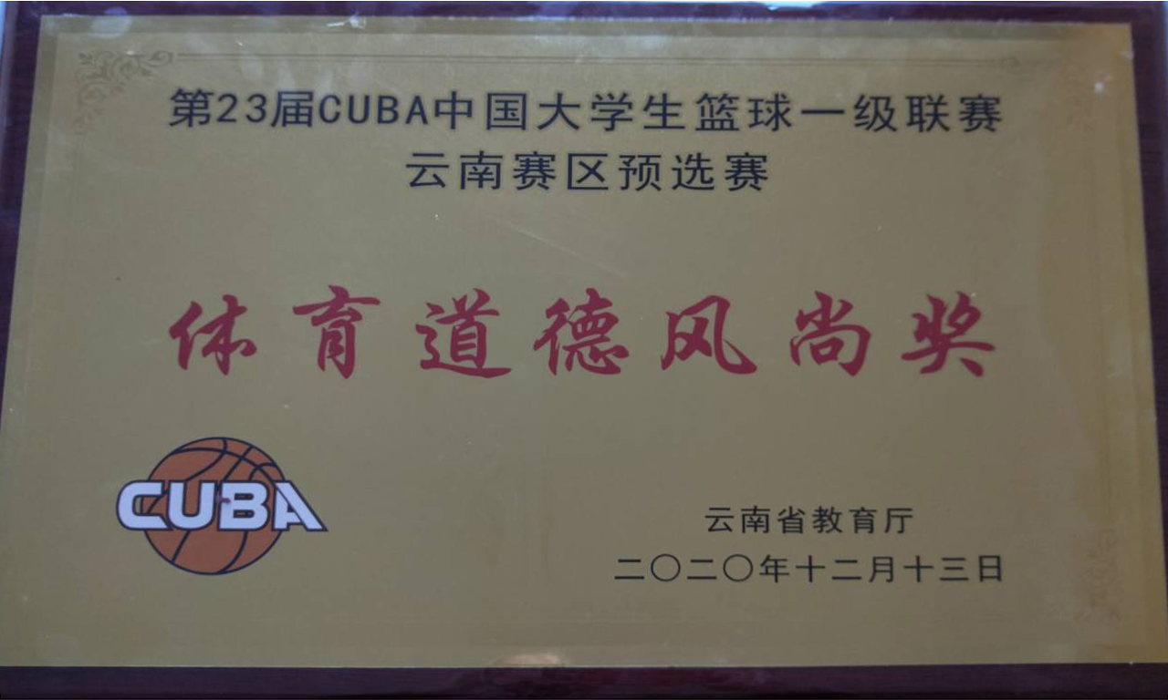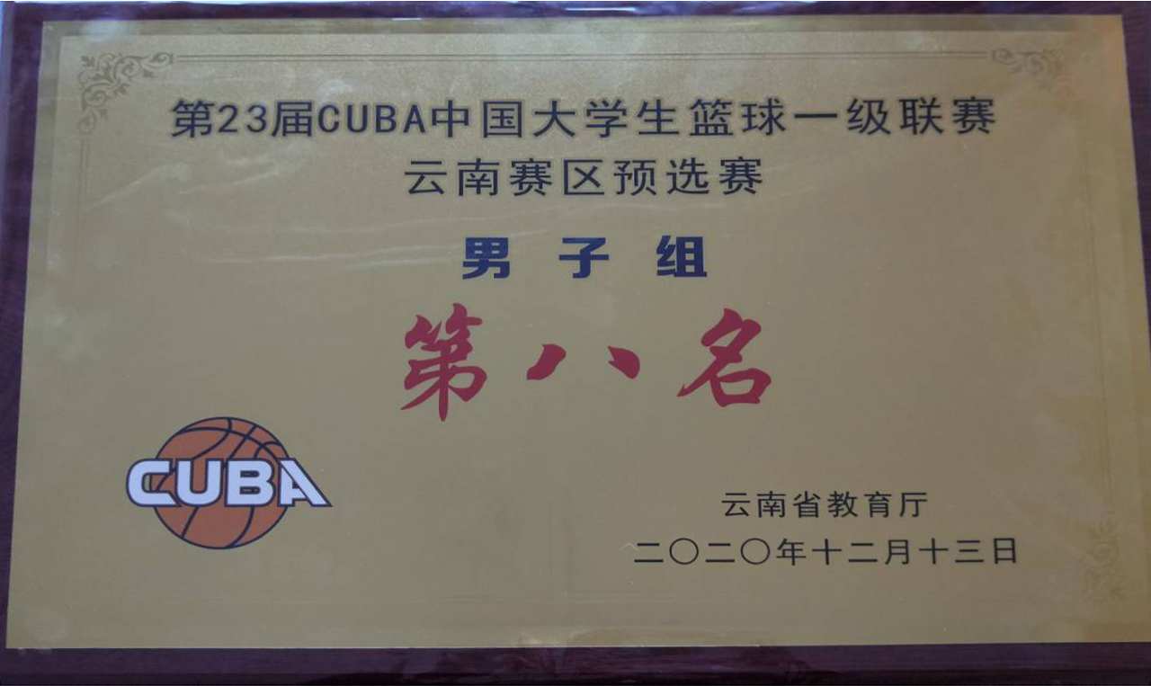 12月6日至13日,由云南省教育厅主办的第23届CUBA大学生篮球一级联赛云南赛区预选赛在云南财经大学举行。经过激烈的角逐,bat365官网学生男子篮球队最终获得男子组第八名,学校获“体育道德风尚奖”,葛锦润获“优秀教练员”,次里打史、尹鸿彰获“优秀运动员”。