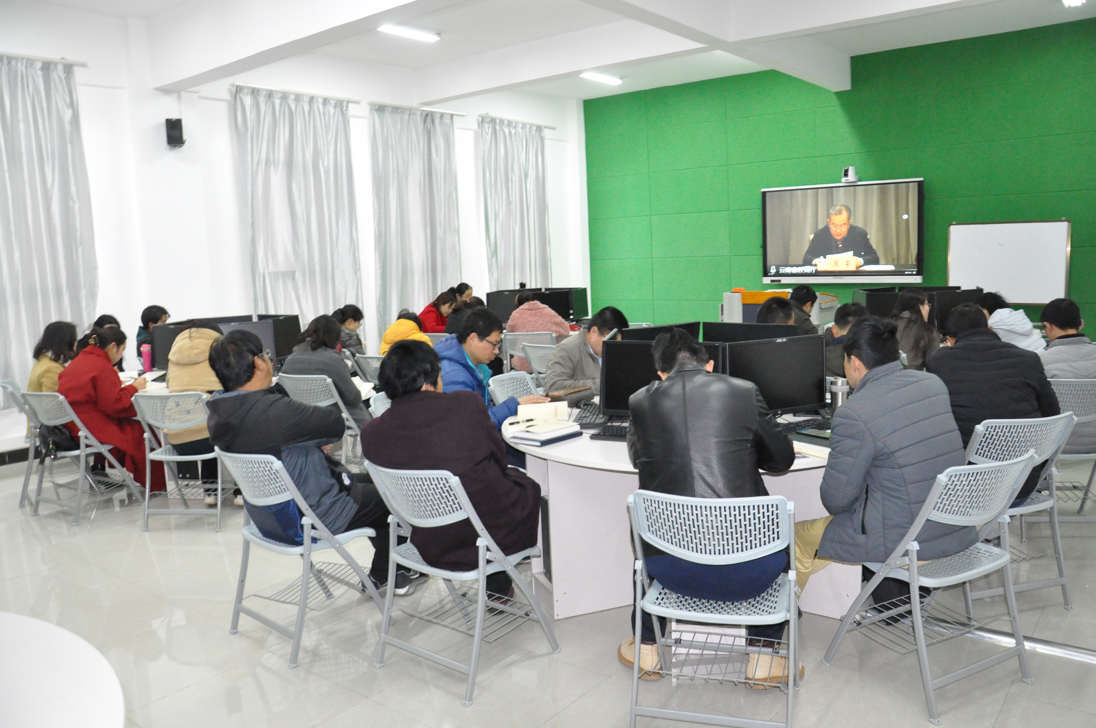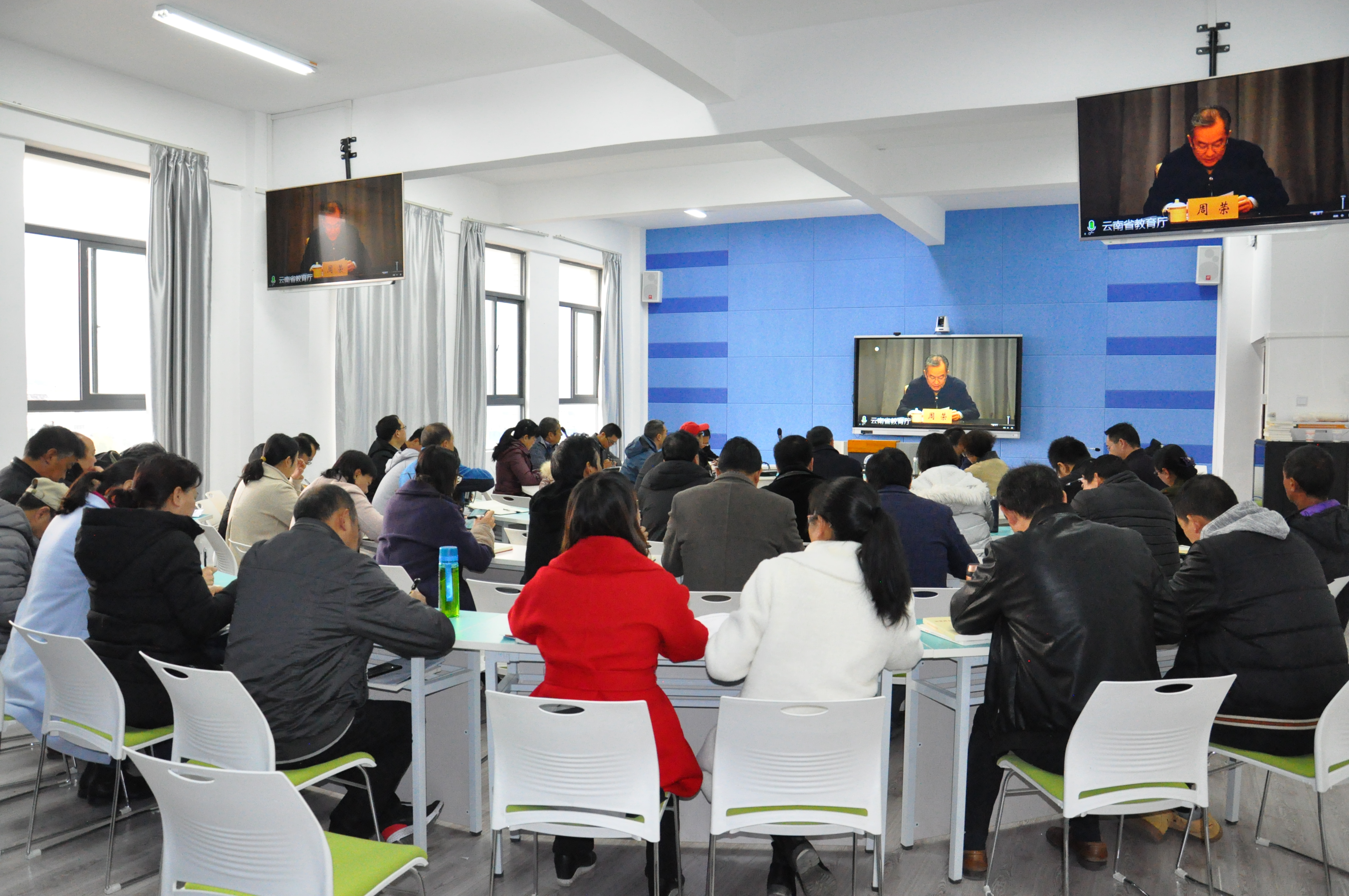 3月5日上午,2021年全省教育系统党风廉政建设工作视频会在昆明召开。省委教育工委书记、省教育厅党组书记、厅长周荣出席会议并代表省委教育工委、省教育厅党组讲话。省纪委省监委驻省教育厅纪检监察组组长沈光善代表驻省教育厅纪检监察组作讲话。省委教育工委常务副书记杨林主持会议。省纪委省监委第一监督检查室主任金涛到会指导,在昆省委教育工委委员、省教育厅党组成员在主会场参会。bat365官网在实训楼502、504 组织参加视频会议,学校全体校领导、正科以上干部参加会议。