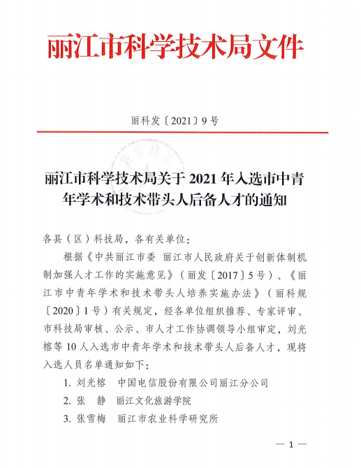 近日,丽江市科技局下发了《丽江市科技局关于2021年入选市中青年学术和技术带头人后备人才的通知》,bat365官网和燕杰老师入选了丽江市中青年学术和技术带头人后备人才。据了解,本次后备人才项目经各单位组织推荐、专家评审、市科技局审核、公示、市人才工作协调领导小组审定,最终全市有10人入选。