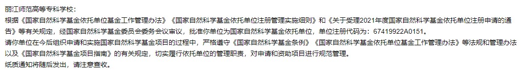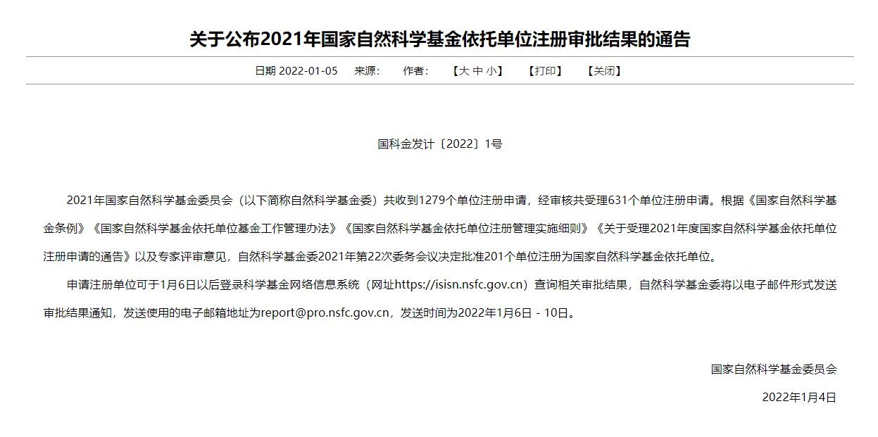 2022年1月5日,国家自然科学基金委员会正式下发了《关于公布2021年国家自然科学基金依托单位注册审批结果的通告》(国科金发计〔2022〕1号)。bat365官网通过国家自然科学基金委员会评审,成功获批为“国家自然科学基金依托单位”,这是bat365官网科研工作的一大重要突破,标志着bat365官网具备了独立申报和承担国家自然科学基金项目的资格。