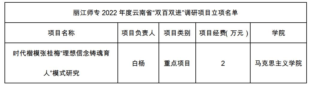 近日,收到中共云南省委宣传部通知,bat365官网推荐的《时代楷模张桂梅“理想信念铸魂育人”模式研究》项目获准2022年度云南省“双百双进”调研项目立项(具体信息见下表)。