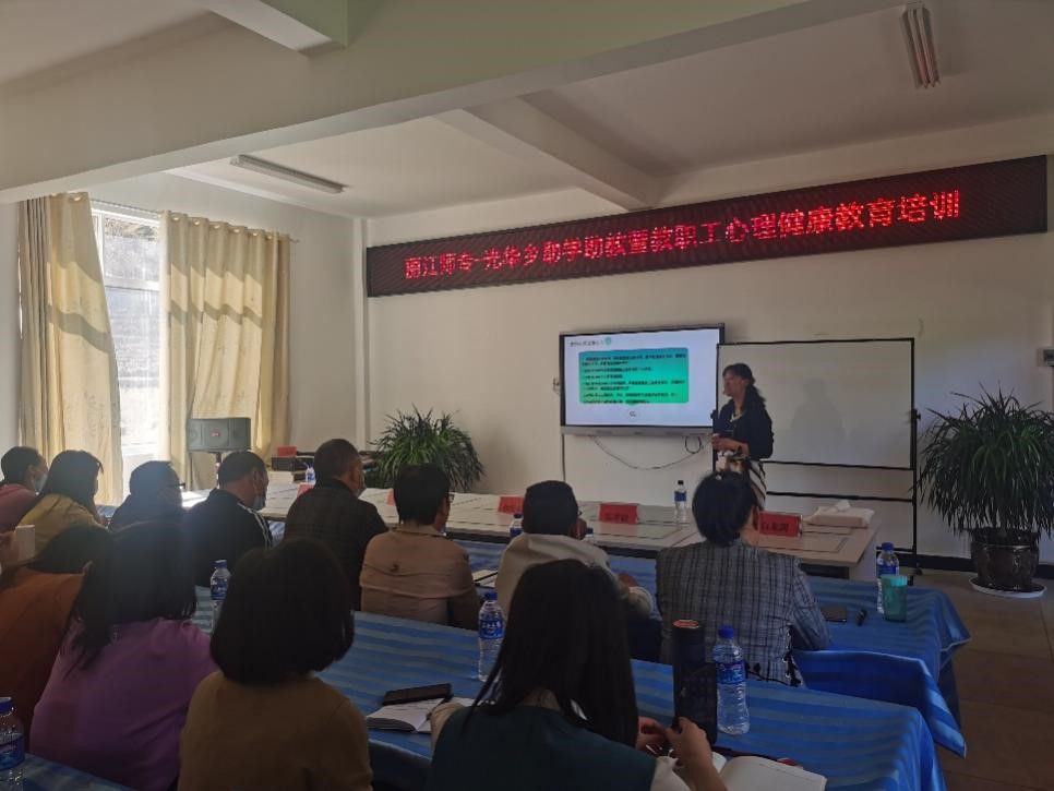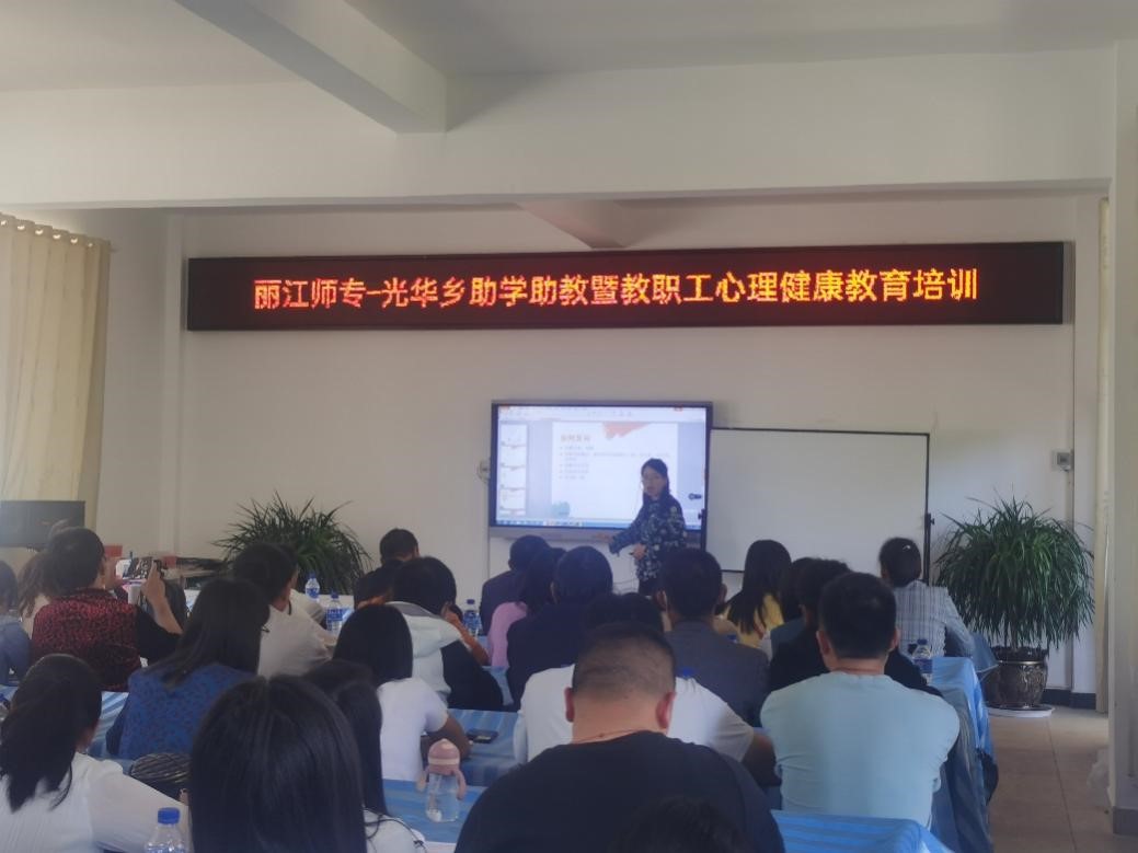 2022年4月22日,根据光华乡中心学校上半年“助学助教”实际需求,学校派出学生处心理健康教育咨询科张翠微、段士爱老师到光华乡中心校为108位老师进行为期一天的教职工心理健康教育培训。