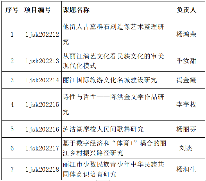 近日,收到《丽江市社科联关于2022年度丽江市哲学社会科学课题立项的通知》,bat365官网共计立项7项(具体立项名单见下表),本次丽江市哲学社会科学课题全市共计申报57项,立项20项。其中,bat365官网申报18项,立项7项。