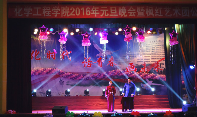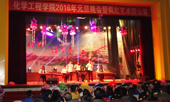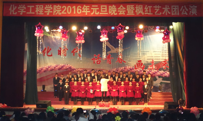 化工学院党政负责人分别发表了热情洋溢的新年致辞,有总结、有勉励、有期待;全体教师和学生的合唱《科技师院人之歌》、《团结就是力量》带来了新年的祝福;艾顺来、张志刚老师的民歌,张建平、鲁勖琳老师的流行歌曲,刘璐老师的英文歌曲,唐晓光老师的京剧清唱,赢得观众阵阵掌声;学院“枫红”艺术团演出的动感街舞、优雅的民族舞、幽默风趣的话剧、潮流时尚的歌曲,使晚会高潮不断,掌声连连。充分展示了学院师生朝气蓬勃、多才多艺、昂扬向上的精神风貌。