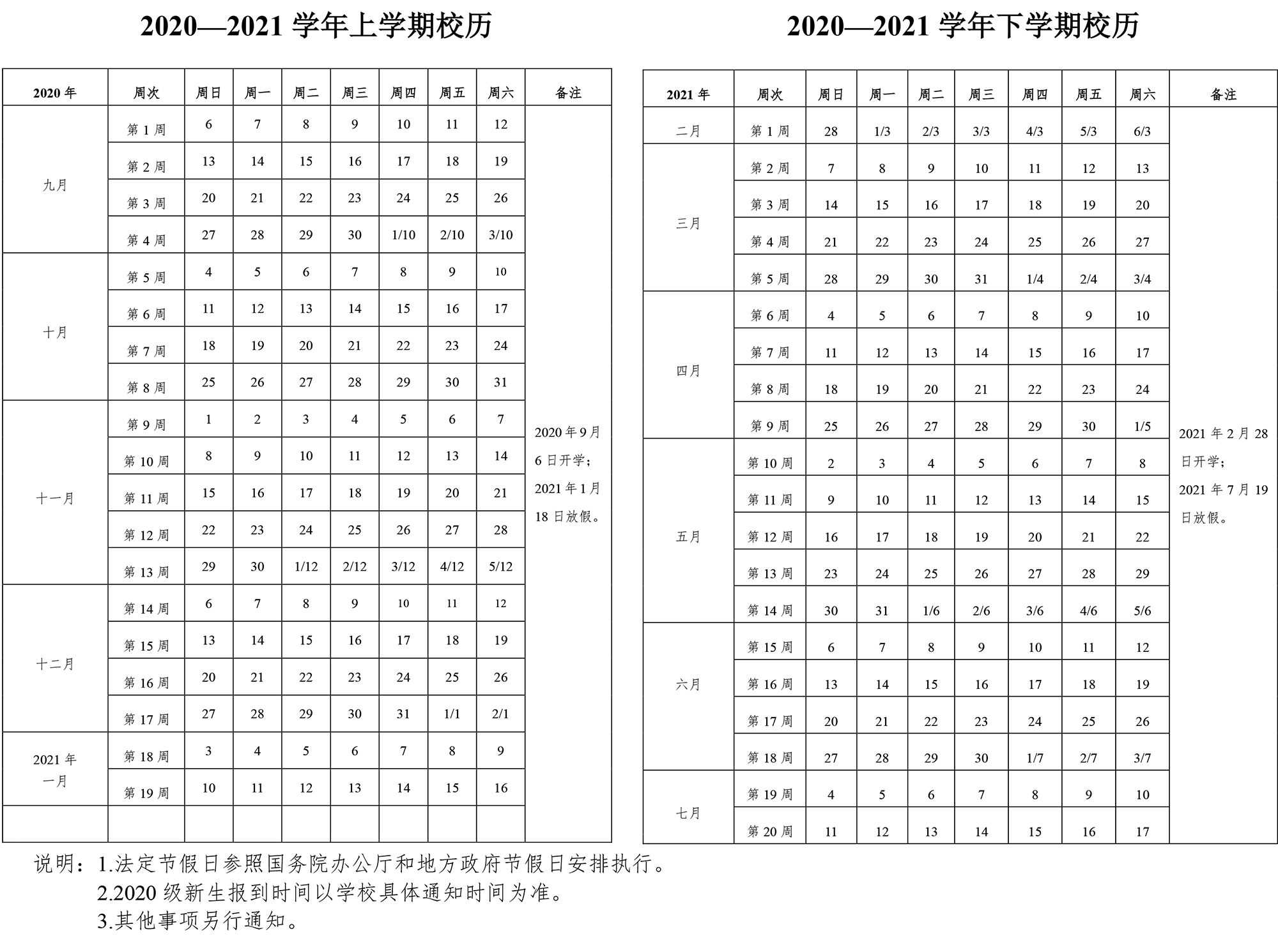 丽江师范高等专科学校2020—2021学年校历