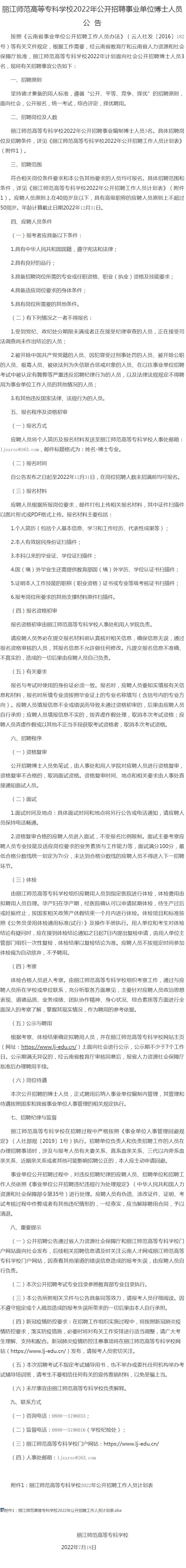 丽江师范高等专科学校2022年公开招聘事业单位博士人员公告